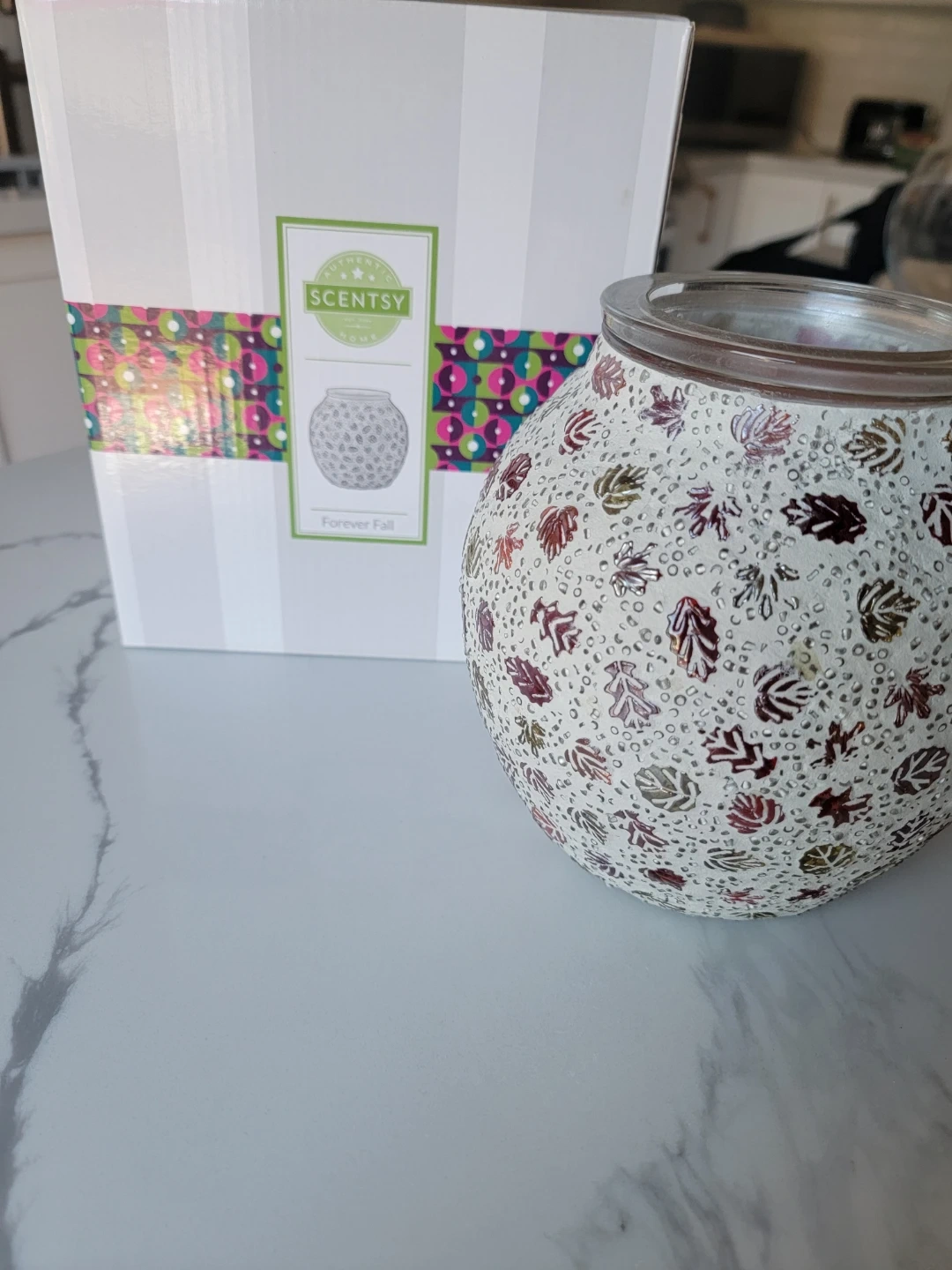 Scentsy "Forever Fall" wax warmer with a festive leaf design. It's perfect for adding a cozy autumn ambiance to your home. This warmer includes its original box.