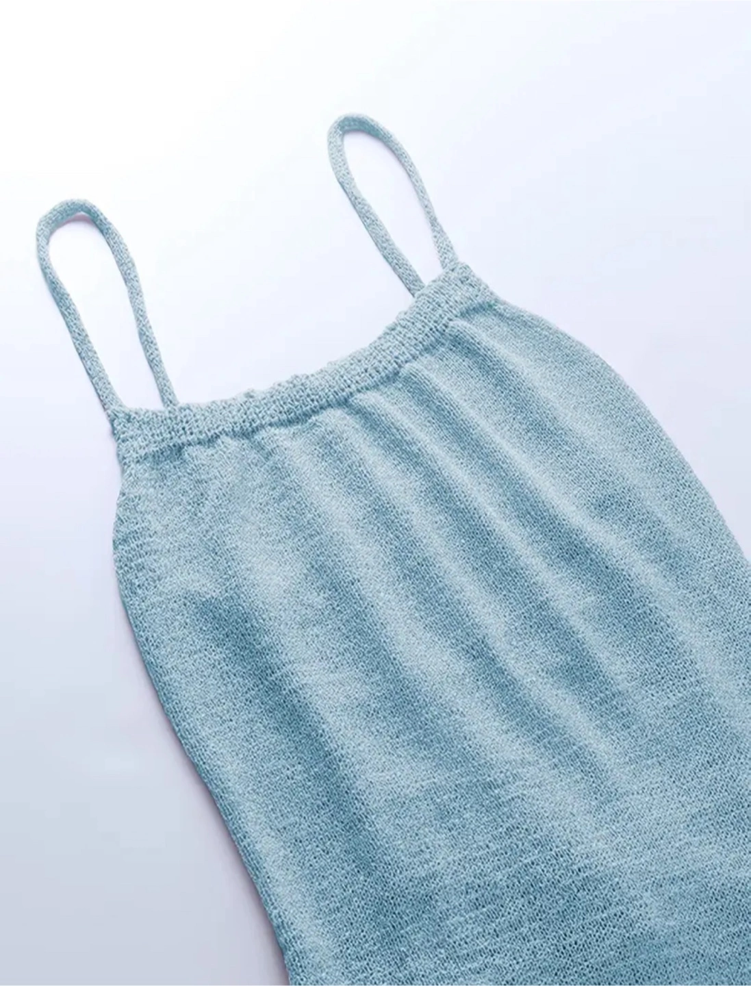 Light blue knit dress. Spaghetti straps. Low back with lace-up detail. Side slit. A perfect dress for enjoying a peaceful summer evening.