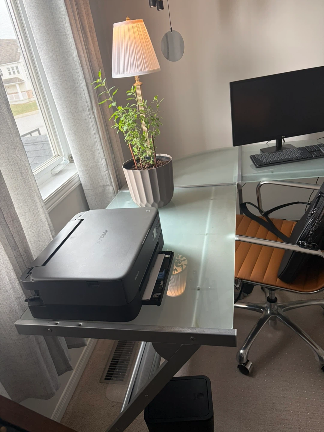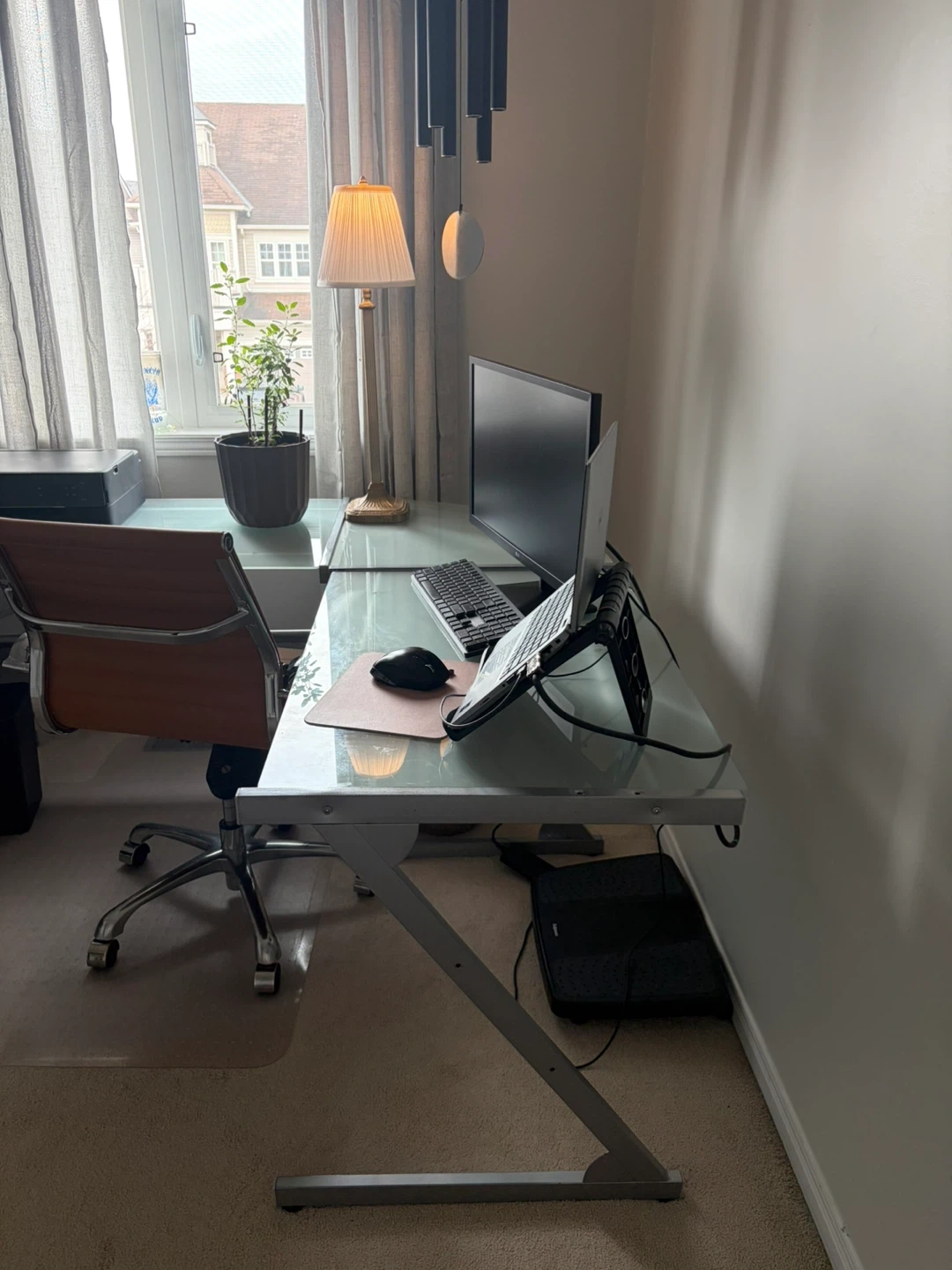 Spacious L-shaped desk with a modern glass top and silver metal frame. It offers ample workspace for computers and office supplies. The desk is designed to fit well in a home office setting.
