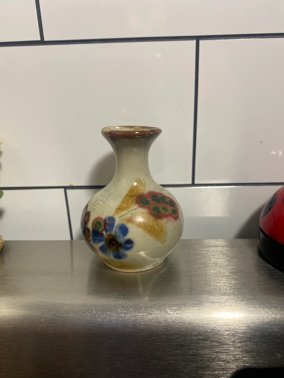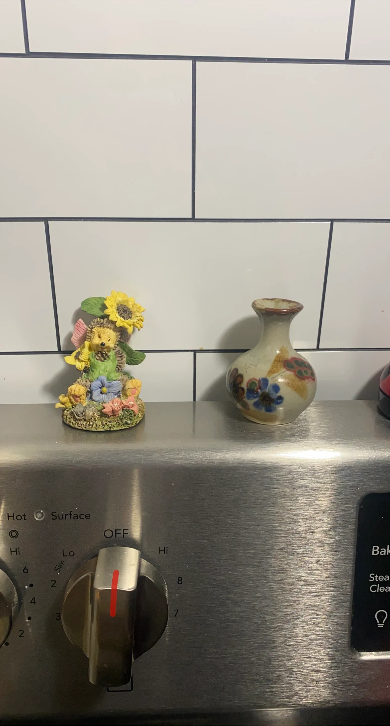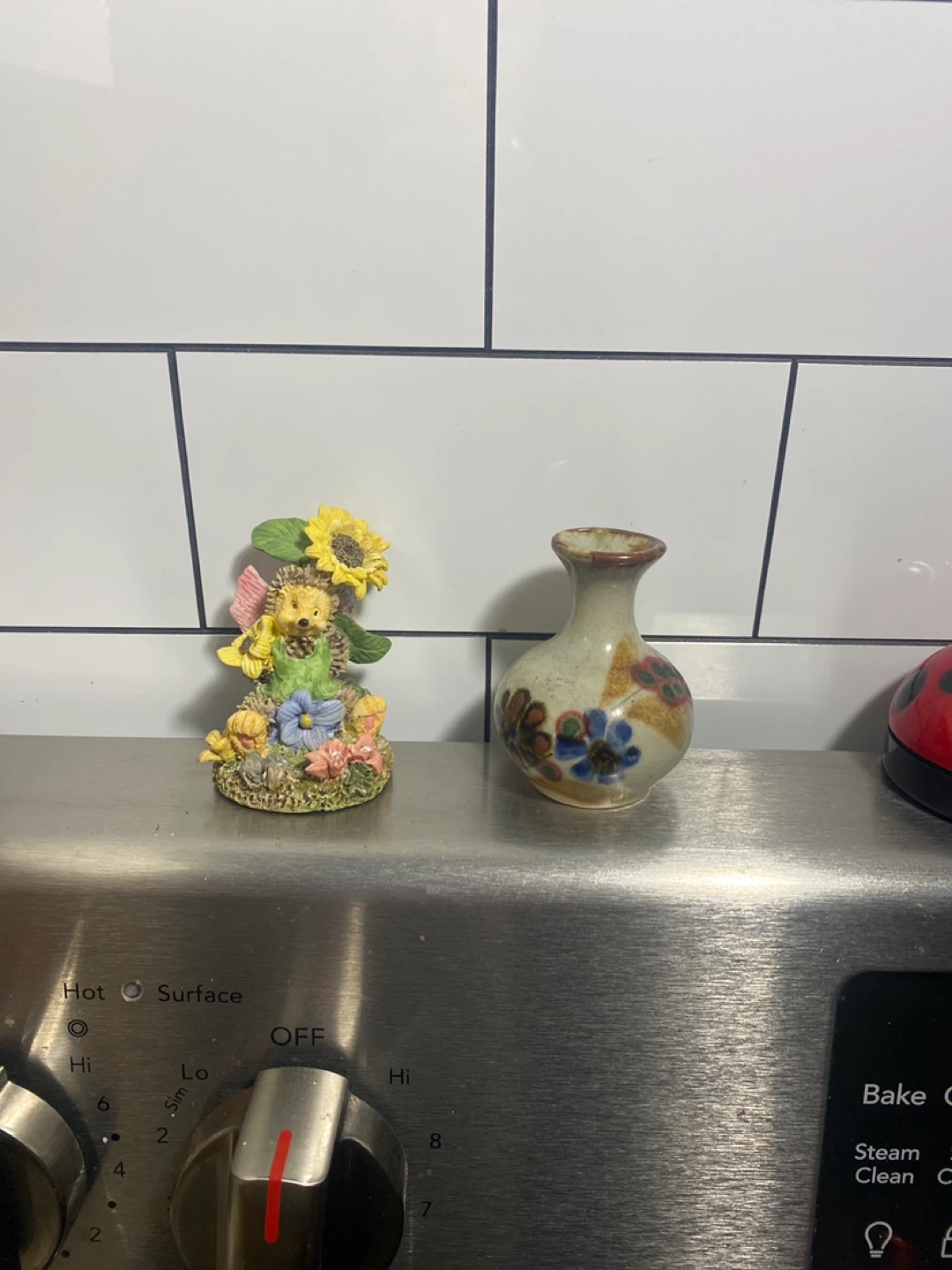 Selling a decorative vase and a cute hedgehog figurine. Both are in good condition and would look great on a shelf or desk! The vase has a unique floral pattern, and the hedgehog is surrounded by colourful flowers