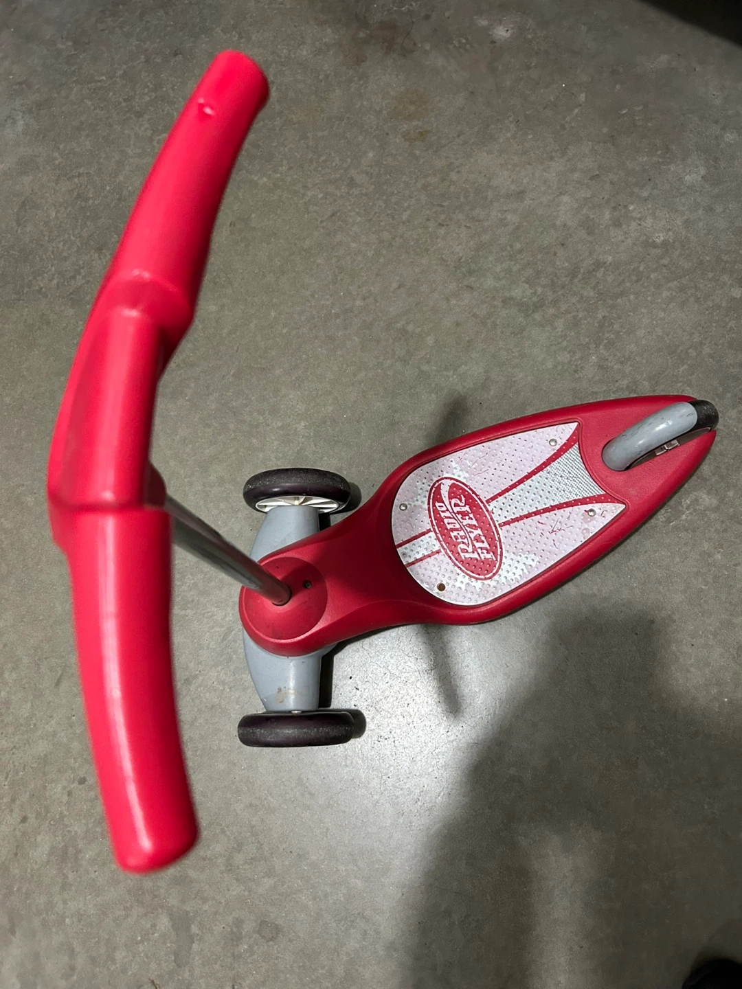 A red Radio Flyer scooter. It's a three-wheeled design for stability. This is perfect for younger riders learning to scoot