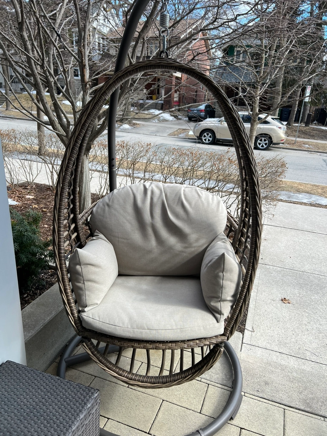 Relaxing egg chair, perfect for patios or porches. Brown wicker construction. Beige cushions included. Great for lounging and enjoying the outdoors. Pickup only