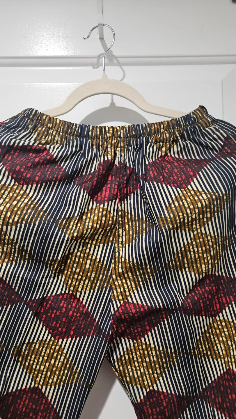 Stylish pants feature a bold, colourful pattern with dark blue, red, and gold accents. They have an elastic waistband for a comfortable fit. Made from a lightweight fabric. Can buy with or without the matching button down shirt for an extra $5. See shirt listing in my full listings.