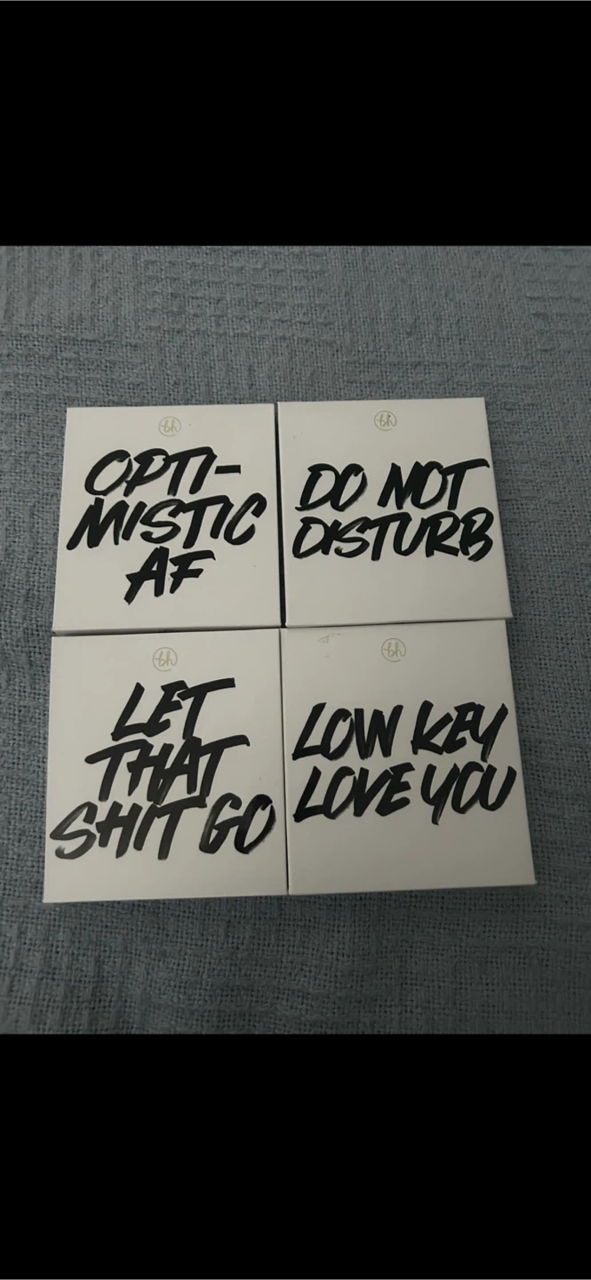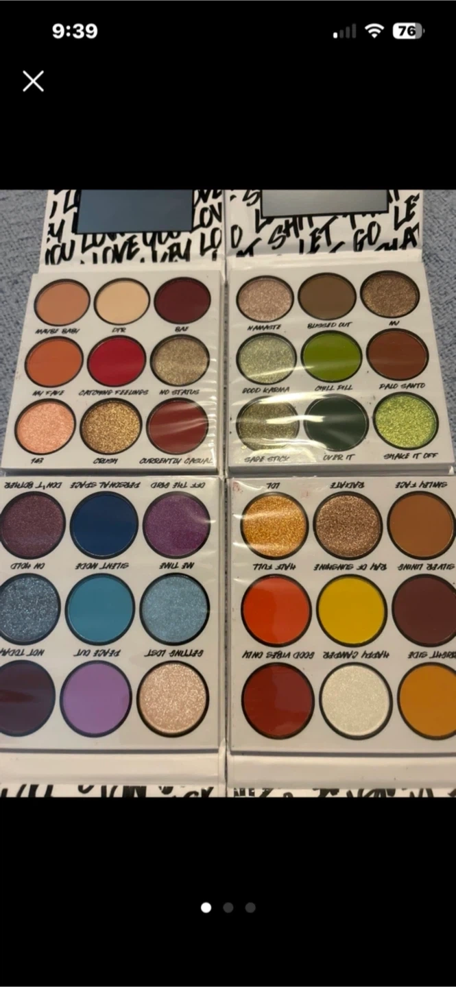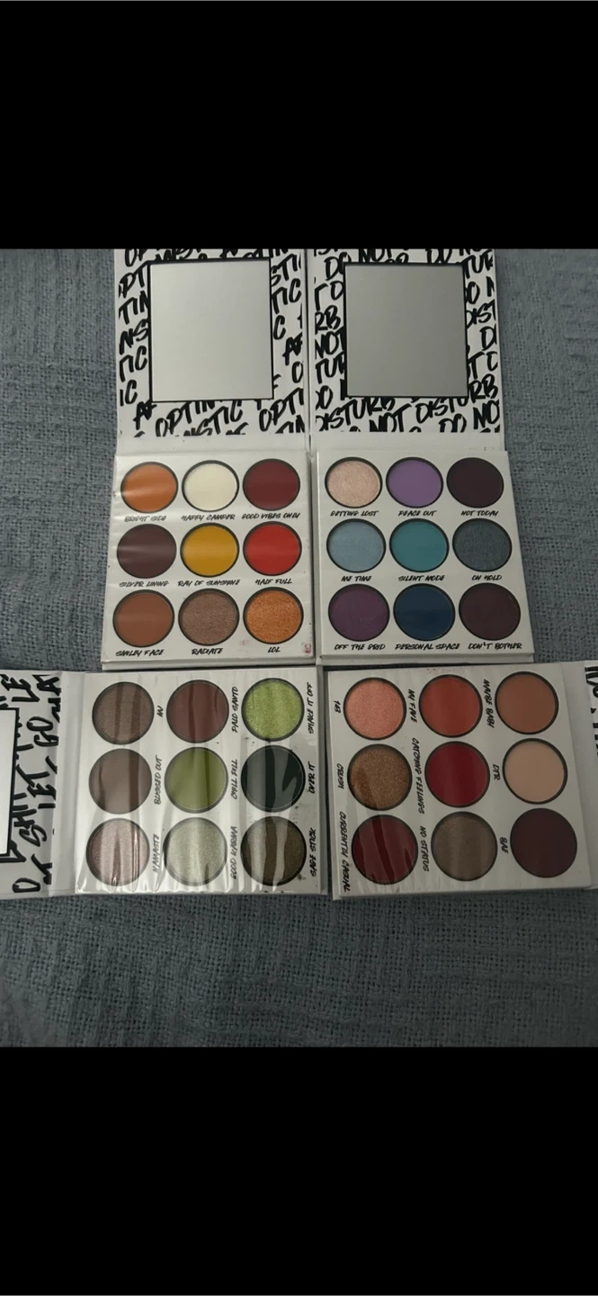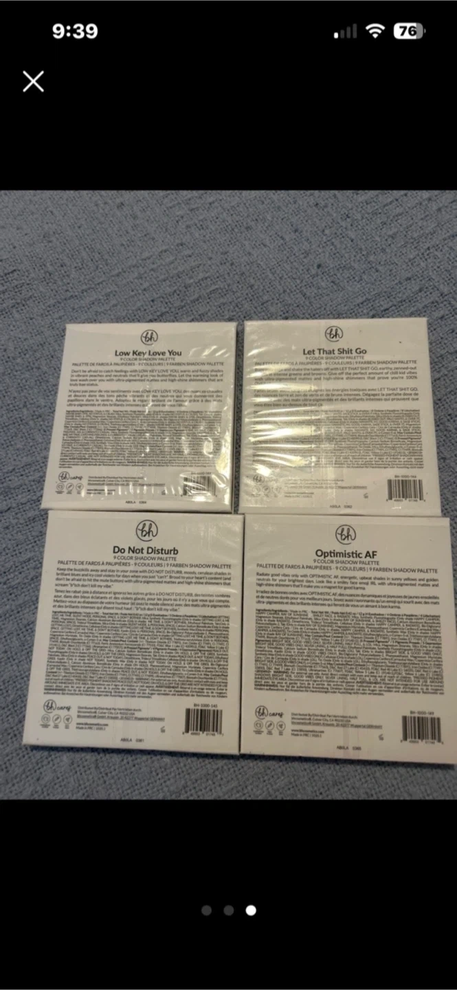 Brand new BH Cosmetics eyeshadow palette collection. Includes 'Optimistic AF', 'Do Not Disturb', 'Let That Sh*t Go', and 'Low Key Love You' palettes. Each palette features 9 shades with a mix of mattes and shimmers.