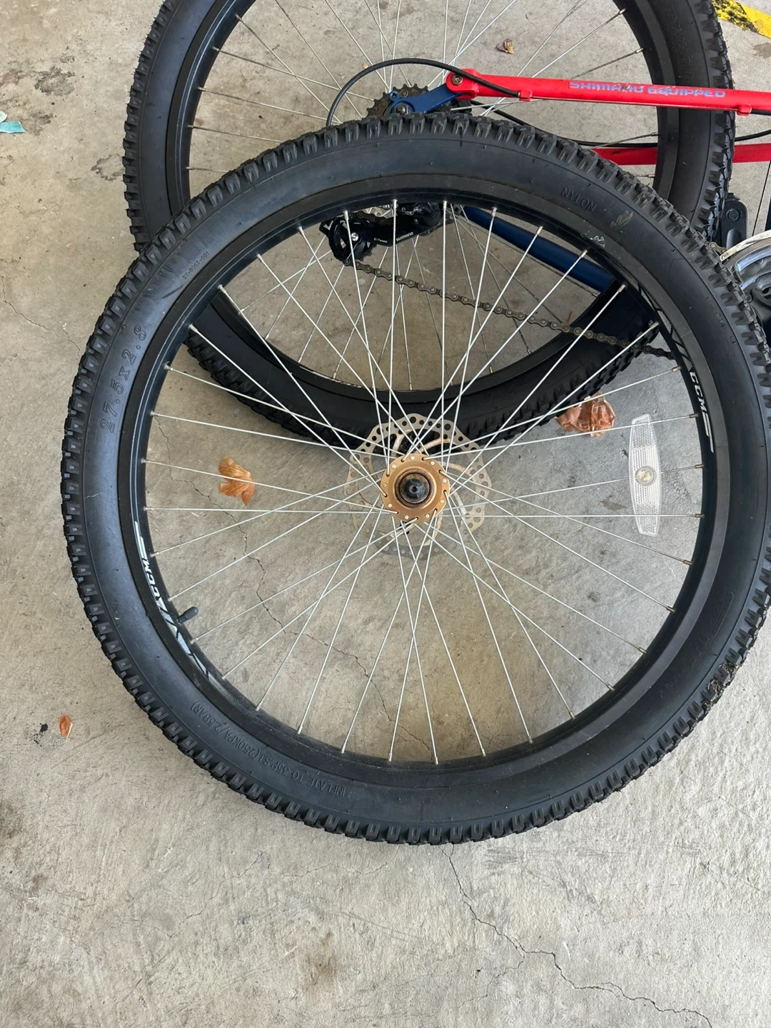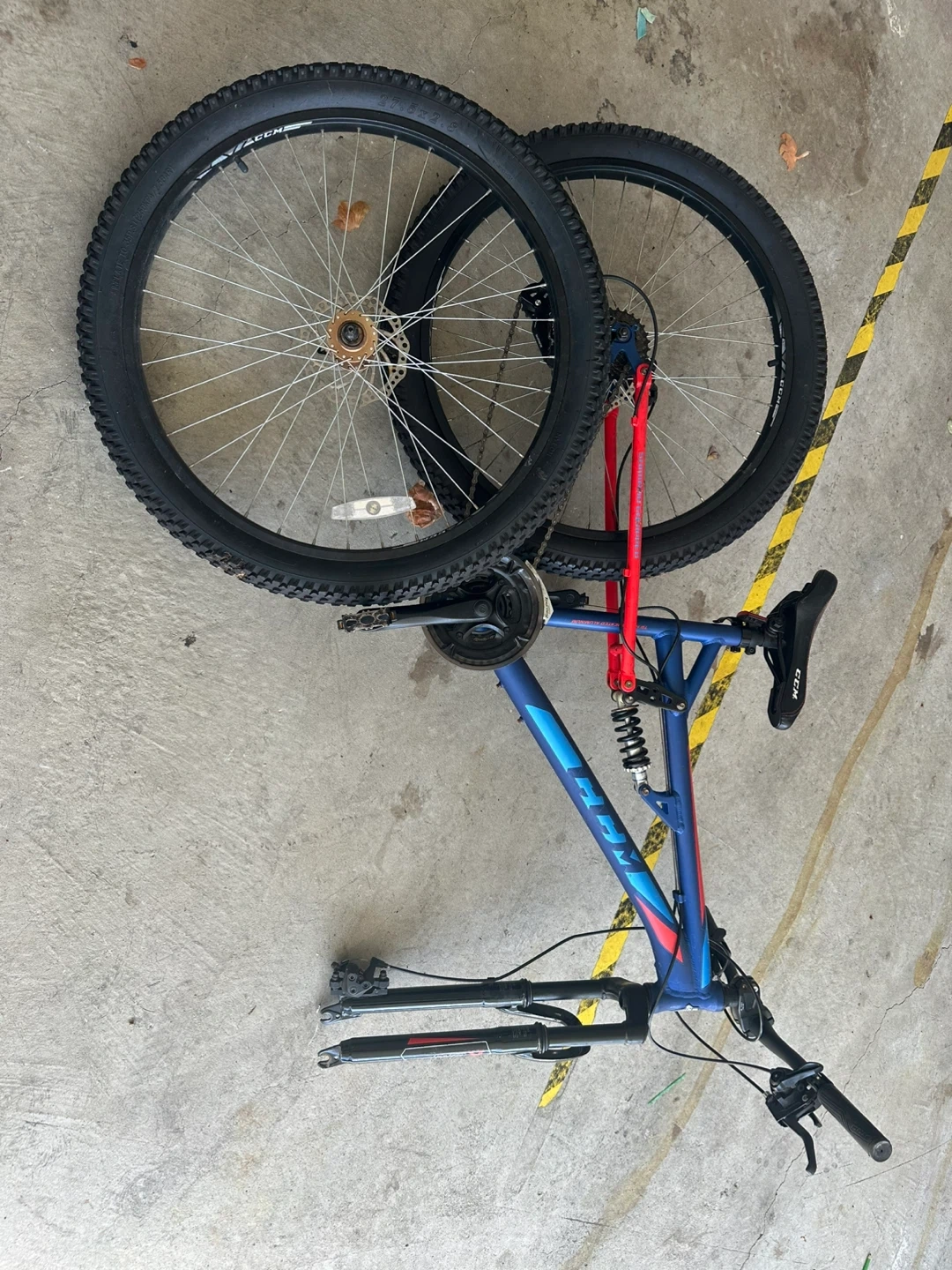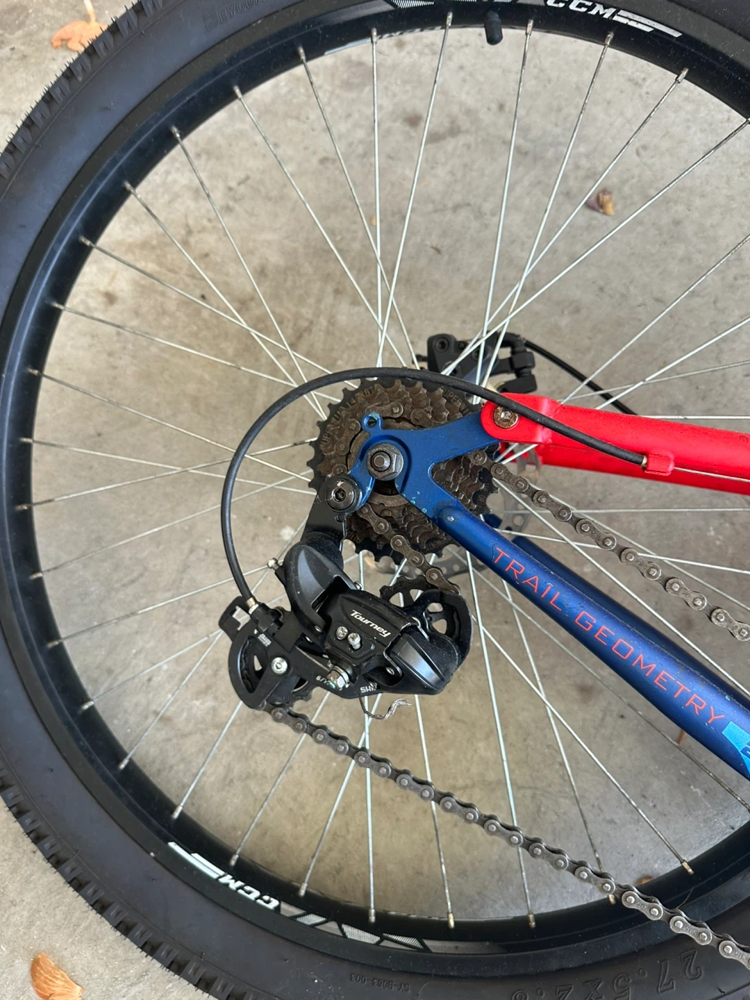 Blue and red CCM mountain bike. Features full suspension and "Trail Geometry" stamped on the frame. Tires are 27.5 x 2.25 inches. Great for trails!