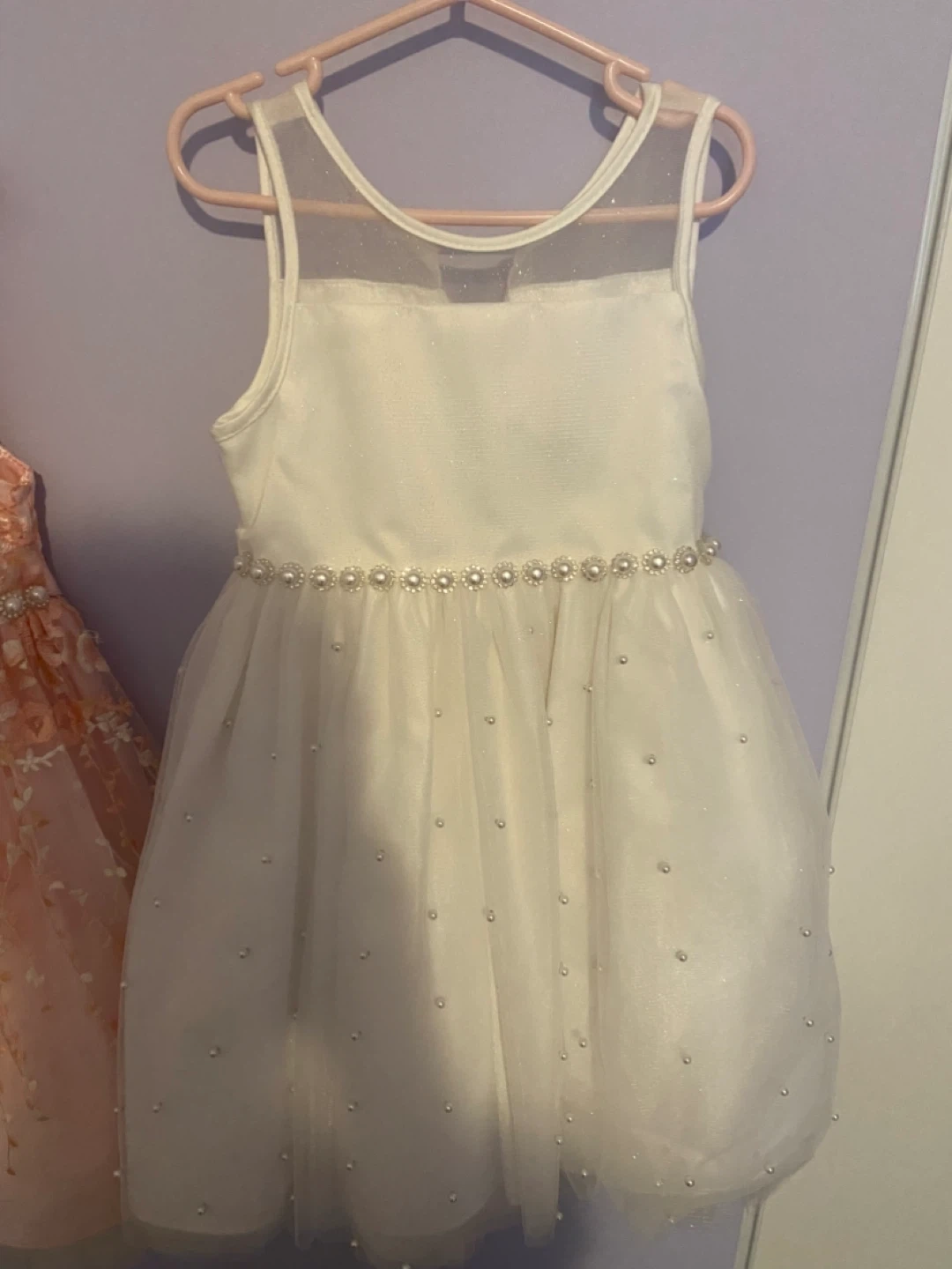 This lovely pink and white party dress features delicate embroidery and pearl accents along the waistband. It has a sleeveless design with a tulle overlay, perfect for special occasions. The dress is made from lightweight, shimmering fabric.