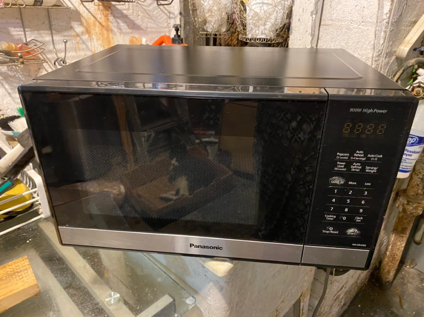 900W high power microwave. Auto cook, reheat, and defrost settings. Multiple power levels. Clean interior. Model NN-SN682S.