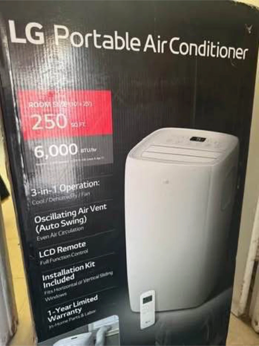 LG portable air conditioner with 6,000 BTU cooling capacity for large room It's a 3-in-1 operation unit featuring cool, dehumidify, and fan modes. Includes an oscillating air vent for even air circulation and an LCD remote for full function control. Installation kit is included and fits horizontal or vertical sliding windows.