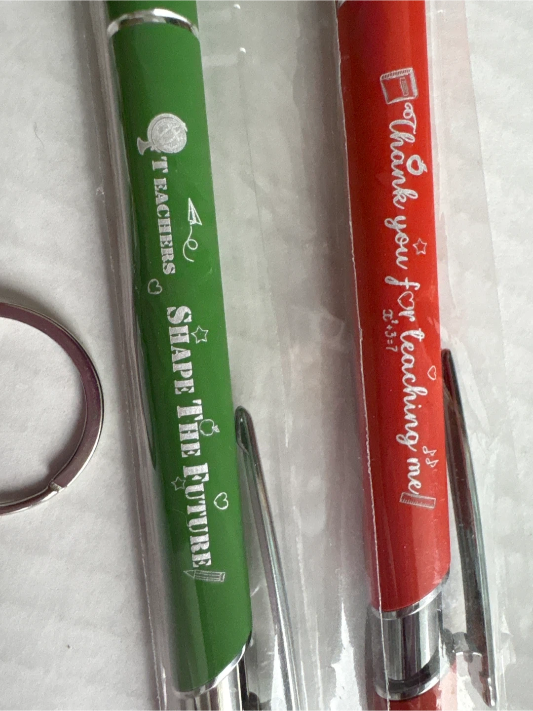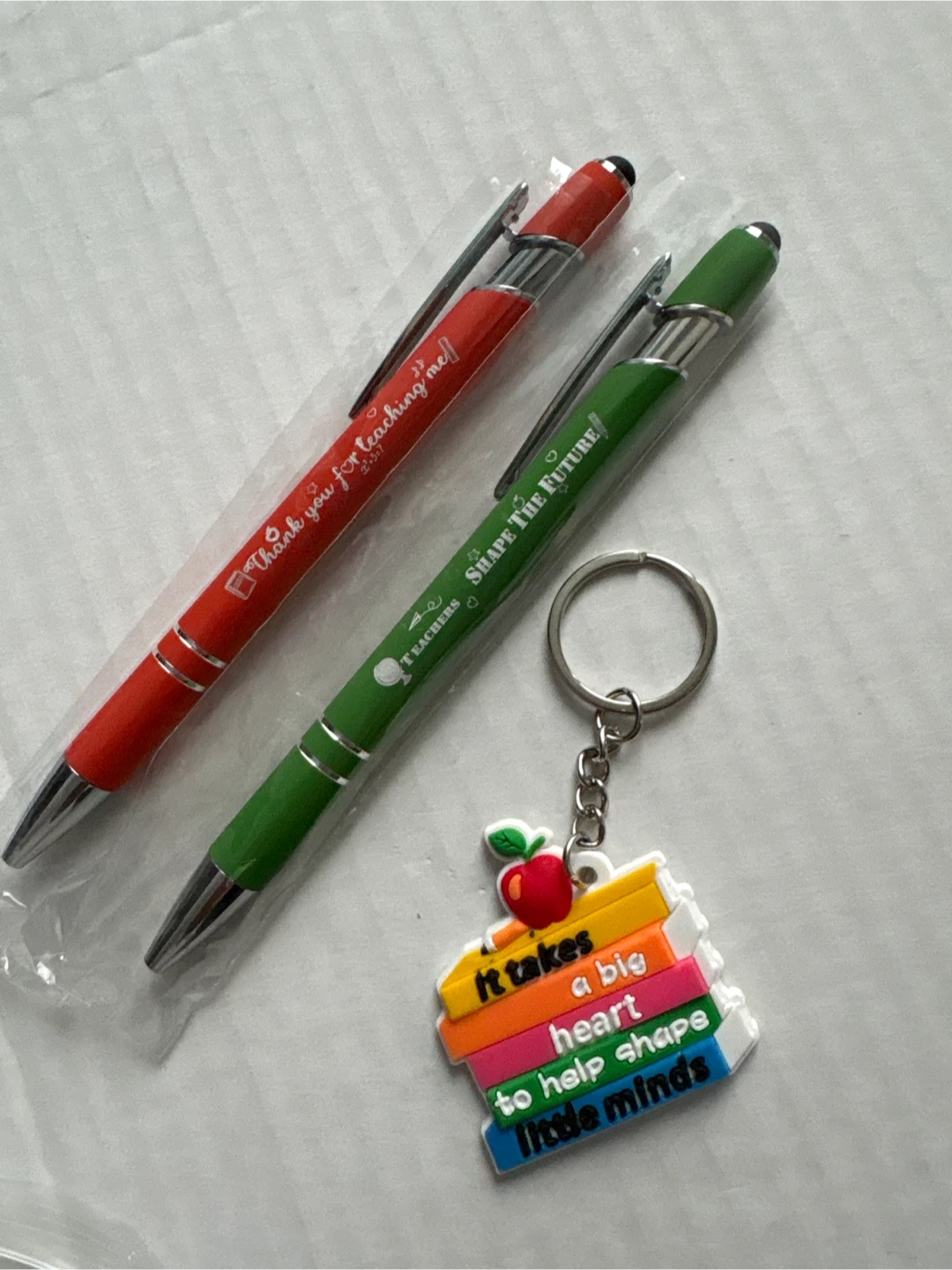 Set includes two pens, one green and one red, with teacher appreciation sayings. Also includes a keychain shaped like stacked books with an apple and pencil detail. This set is a thoughtful gift for educators. Great for Teacher Appreciation Week!