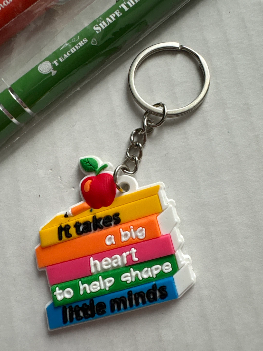 Set includes two pens, one green and one red, with teacher appreciation sayings. Also includes a keychain shaped like stacked books with an apple and pencil detail. This set is a thoughtful gift for educators. Great for Teacher Appreciation Week!