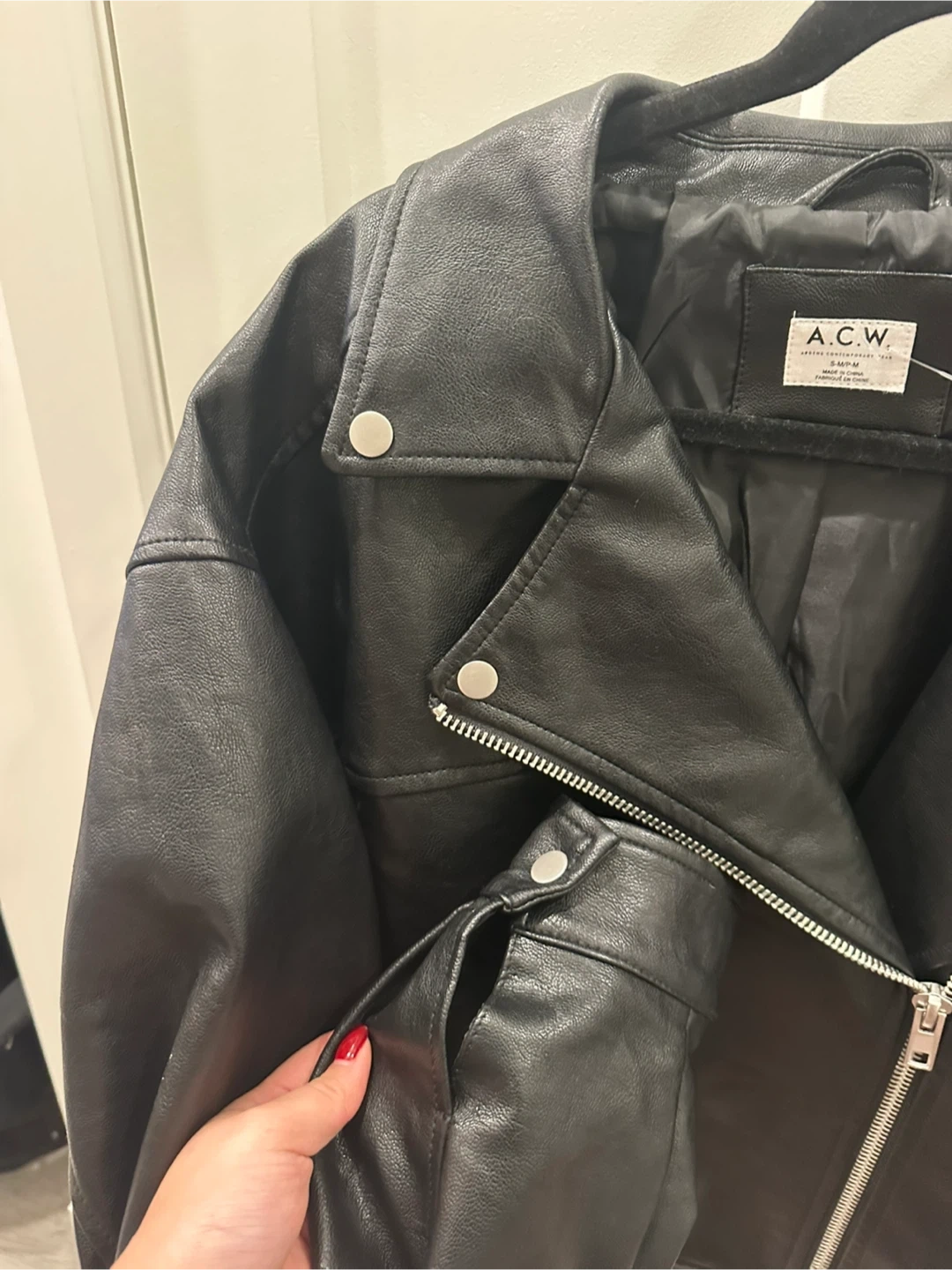 A stylish black faux leather moto jacket from A.C.W. It's a size small/medium with a classic asymmetrical zip-up front and snap-button lapels. This jacket's sleek design makes it a versatile layering piece.