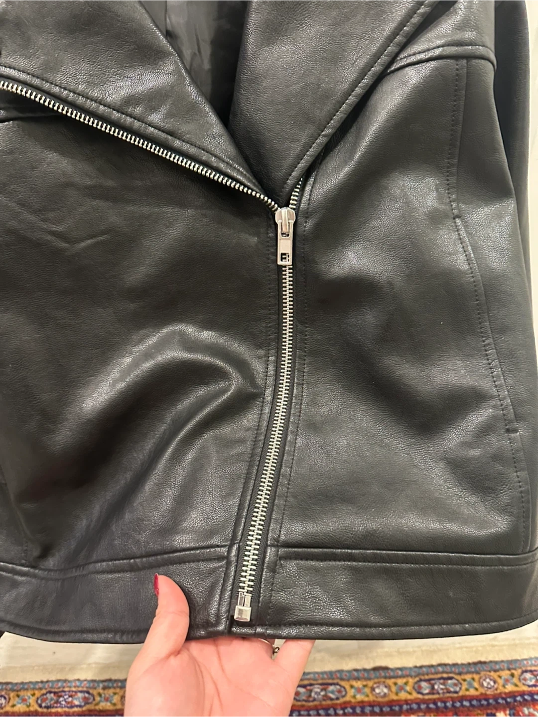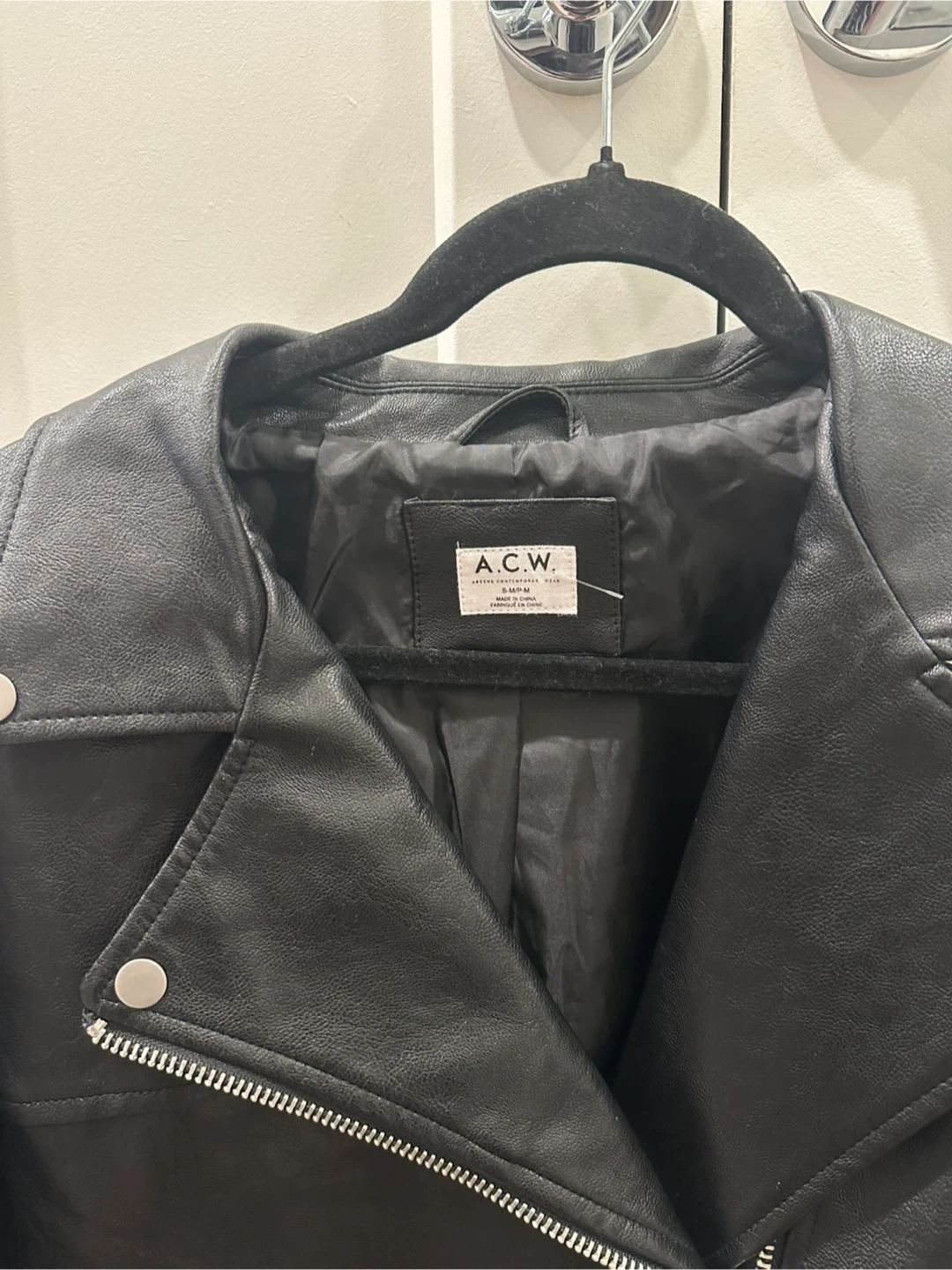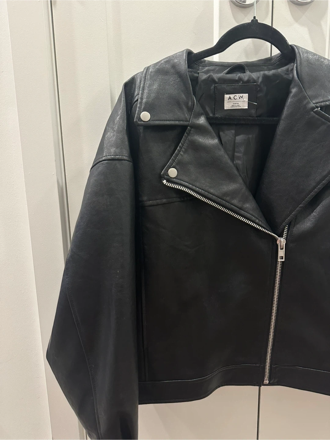 A stylish black faux leather moto jacket from A.C.W. It's a size small/medium with a classic asymmetrical zip-up front and snap-button lapels. This jacket's sleek design makes it a versatile layering piece.
