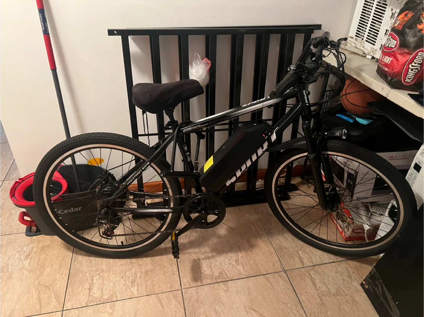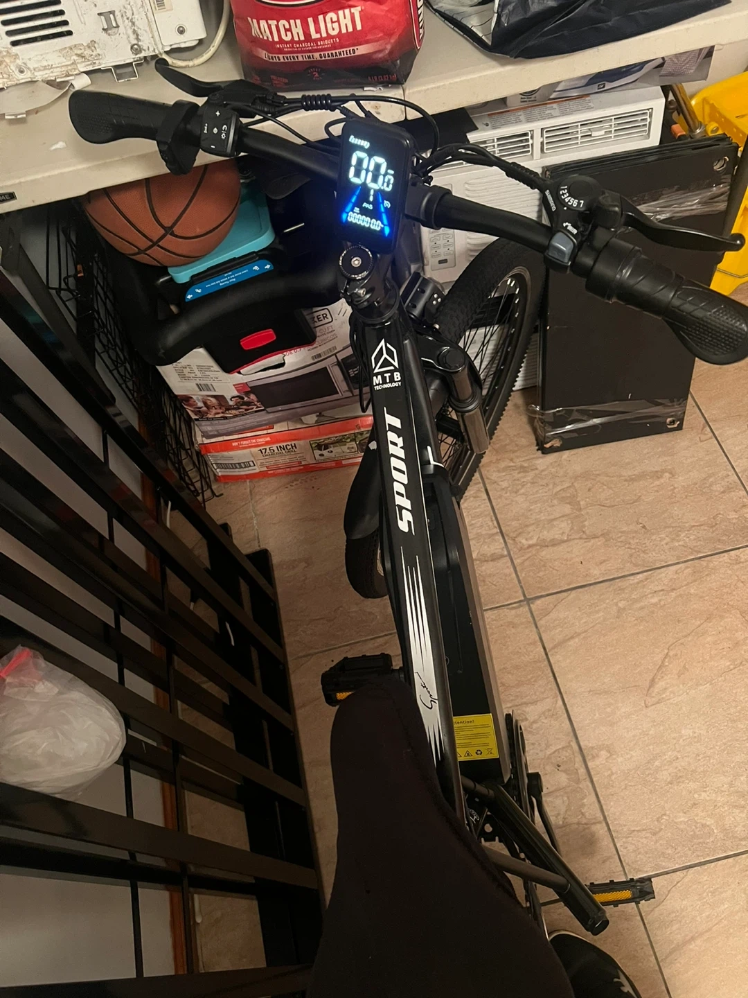 This is an electric mountain bike with a sporty design. It features a digital display on the handlebars. It's a black electric bike ready for your adventures!