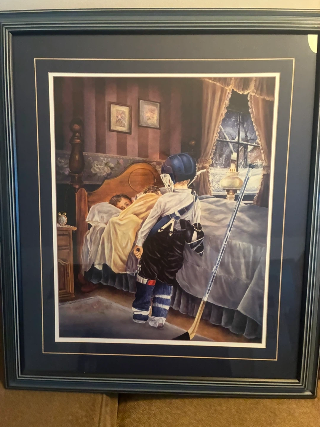 Selling a framed print featuring a young hockey player. It's a charming piece that would look great in a kid's room or any hockey fan's collection. The frame is in good condition and ready to hang!