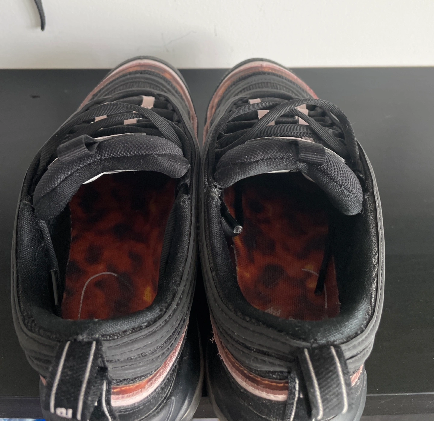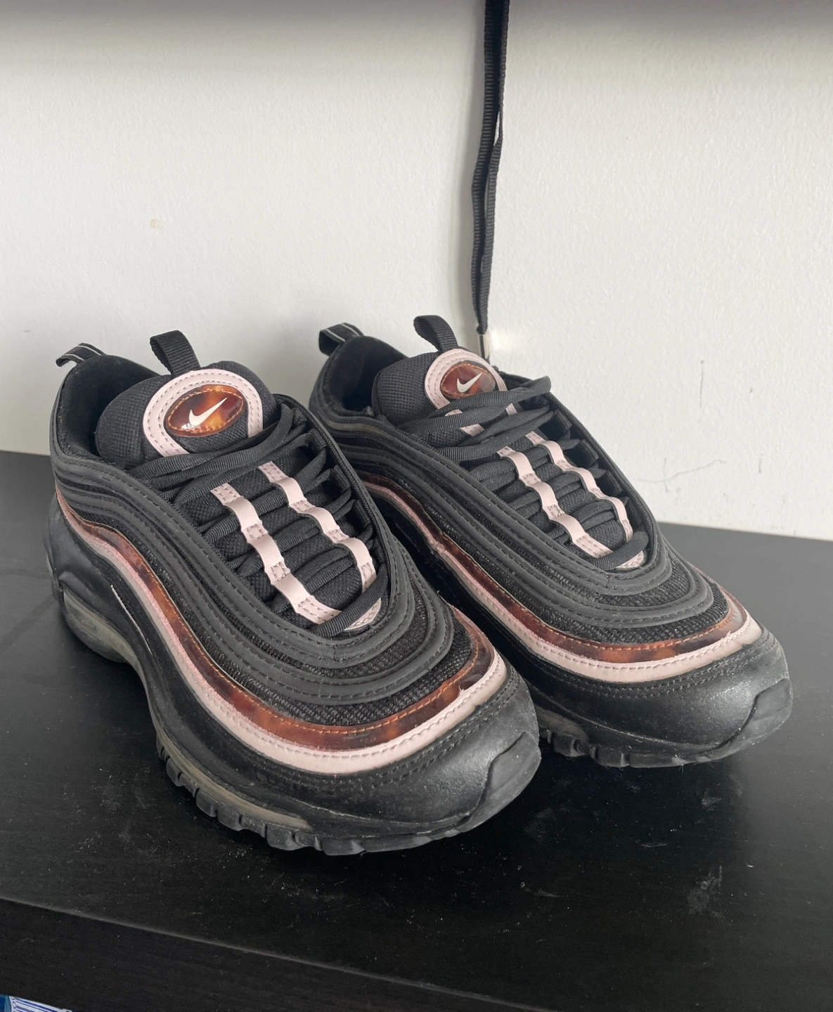 Nike Air Max 97 running shoes. Black with rose gold accents. Slight wear visible. Great for casual wear.