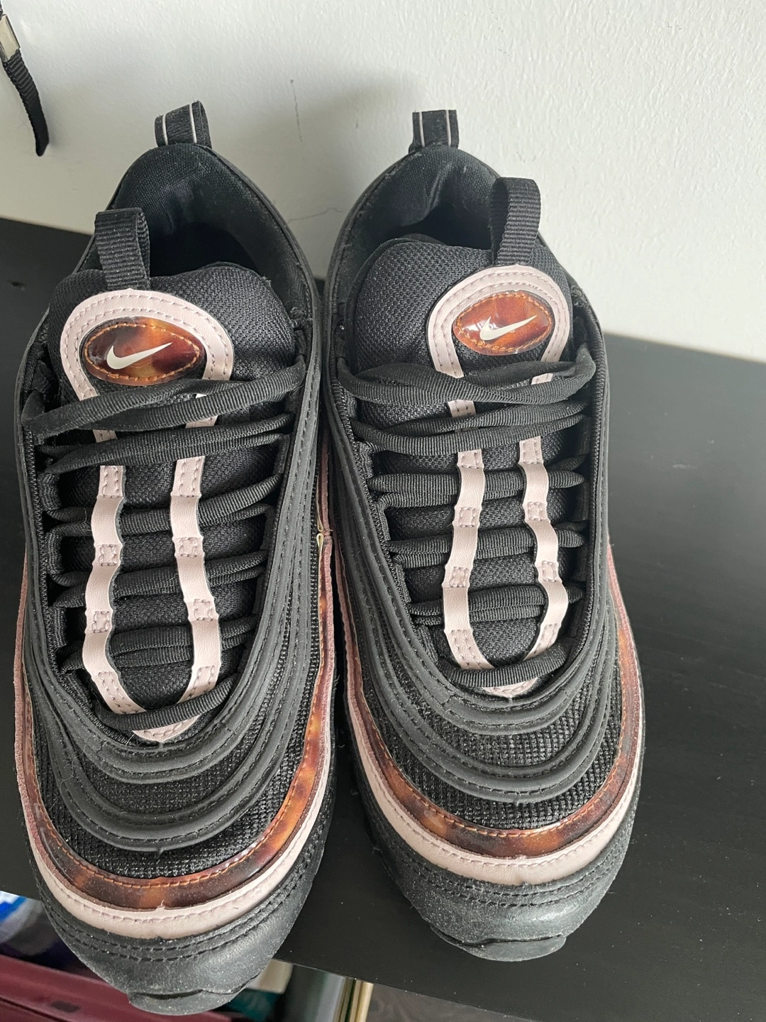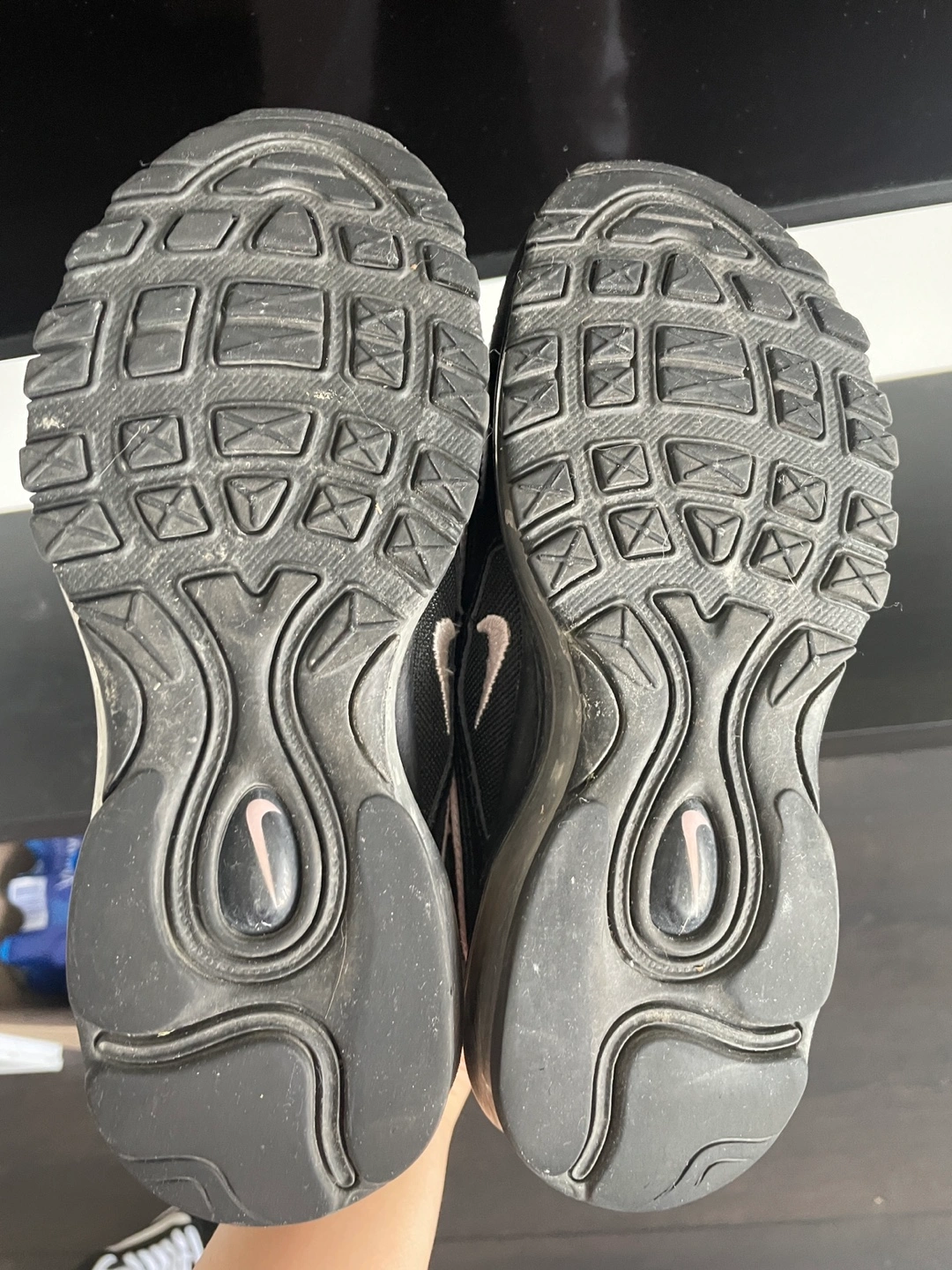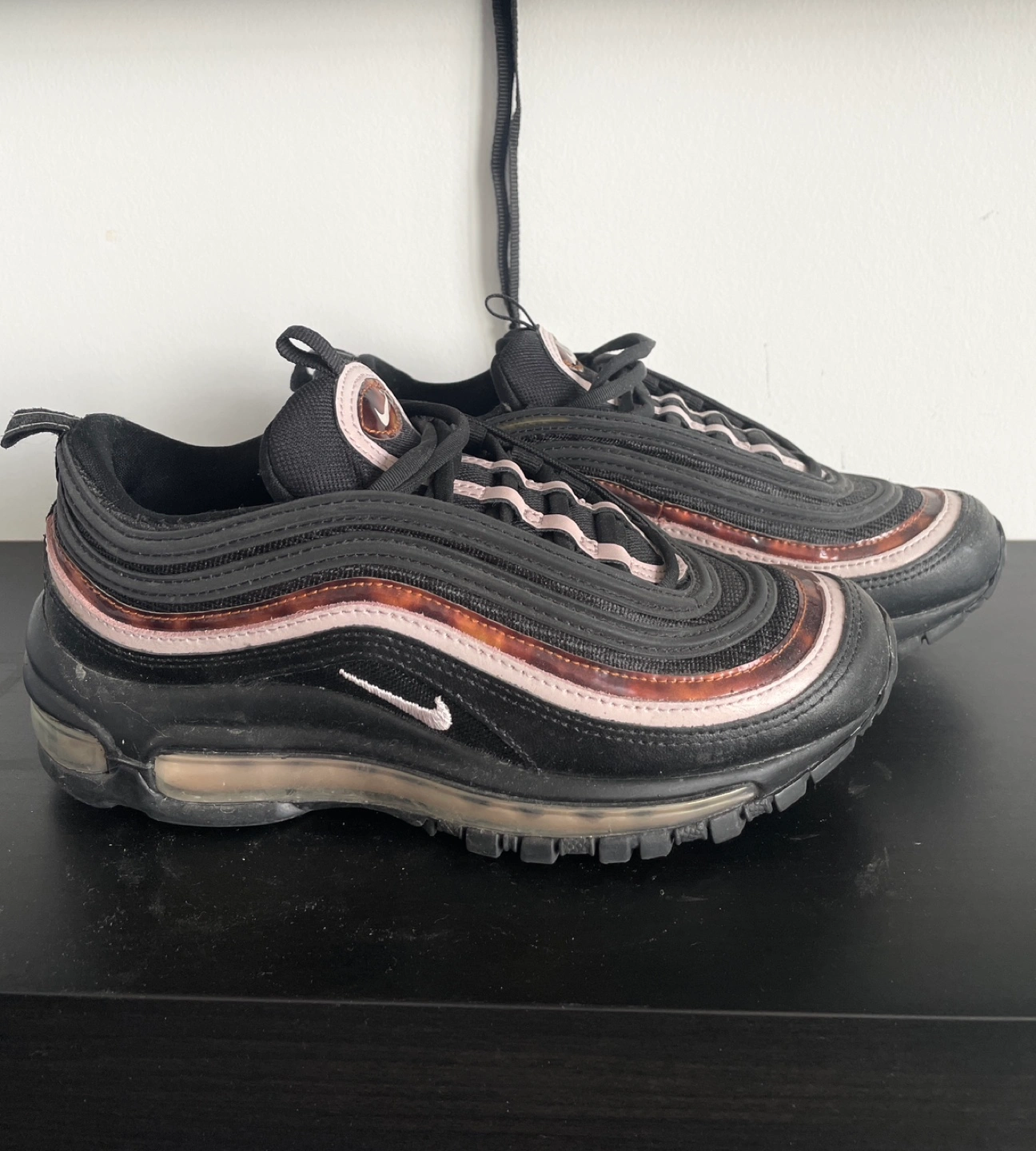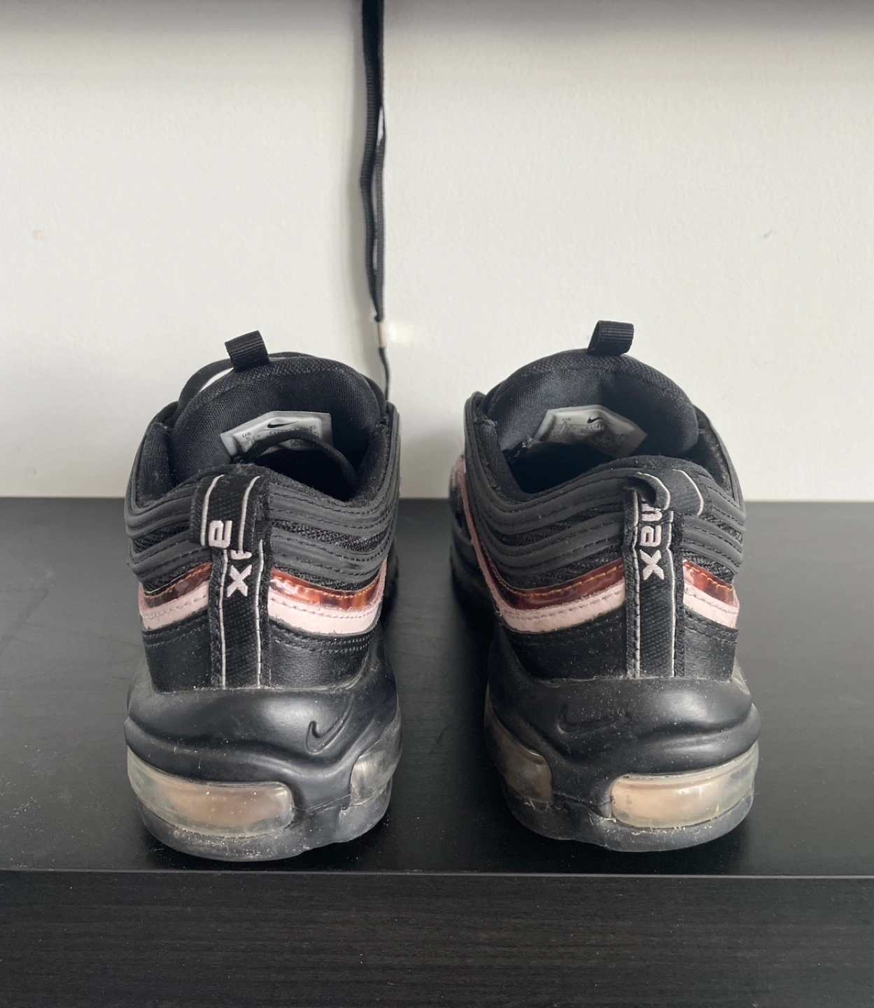 Nike Air Max 97 running shoes. Black with rose gold accents. Slight wear visible. Great for casual wear.