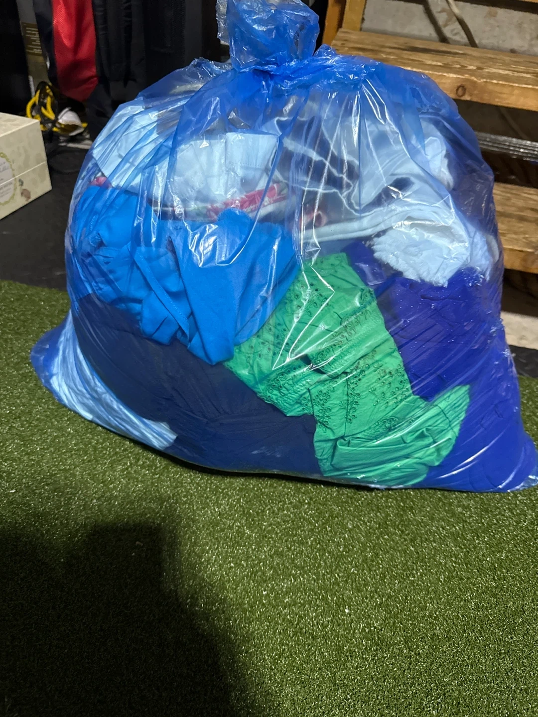 Blue plastic bag filled with a variety of clothing items. Includes tops, pants, and other apparel in multiple colours like blue, green, and white. Perfect for a bulk buy or for repurposing.