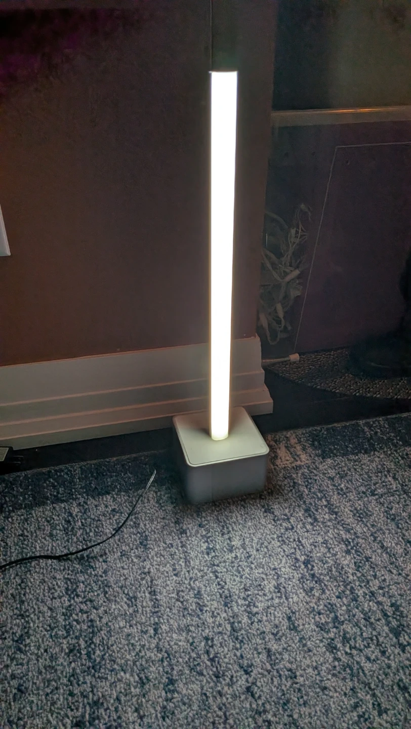 This is a modern vertical tube floor lamp. It's a sleek lighting solution for any room. The lamp emits a bright, clean light. The base is a simple square shape.