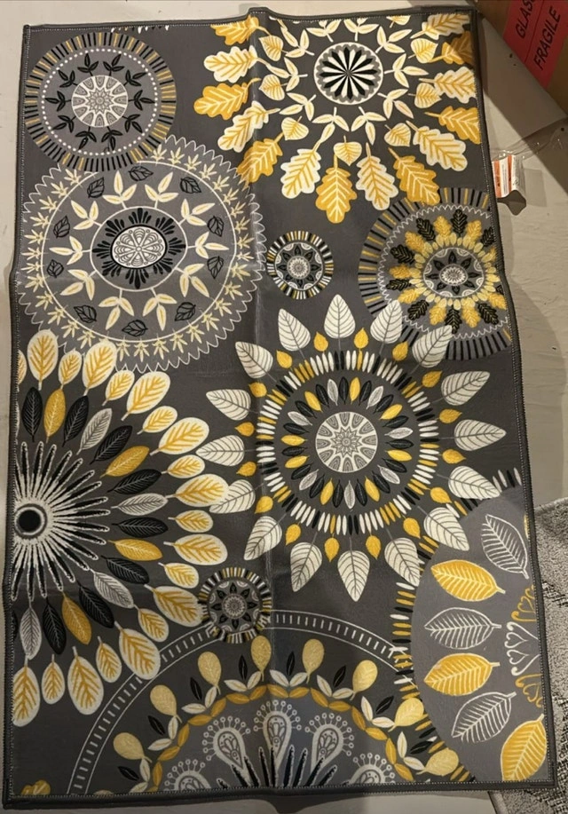 This grey washroom mat features a lovely leaf and floral pattern in tones of yellows, greys, and whites, adding a touch of elegance and comfort to your space. As this is a new item, it is a set of 3. It's like a little piece of art for your feet! If the ad is up, it's still available!