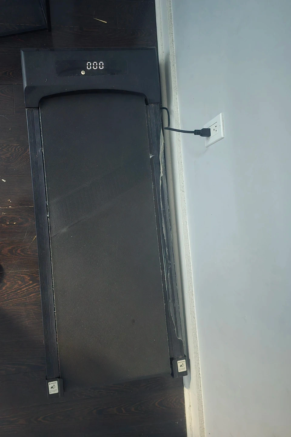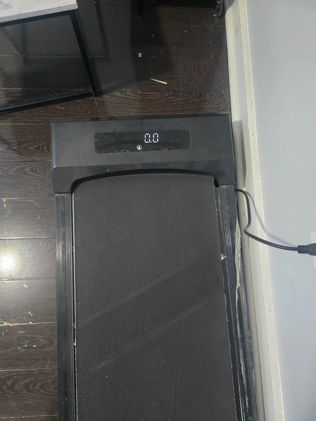This is a black compact treadmill. It has a digital display showing speed and distance. It's a good option for home workouts.