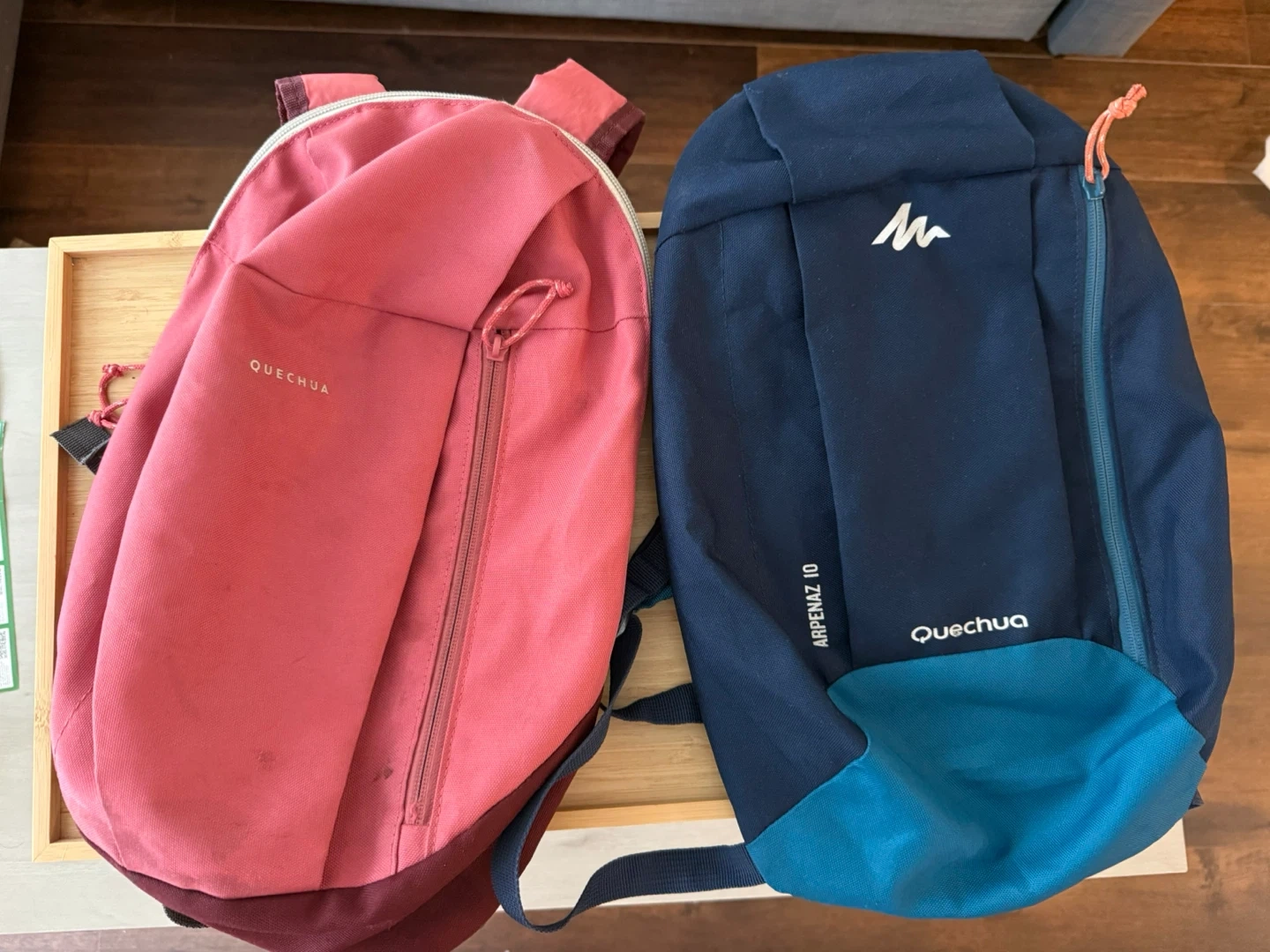 This is a set of two Quechua backpacks. One is pink and the other is navy blue with teal accents. The navy backpack is the Arpenaz 10 model. It's great for day trips!