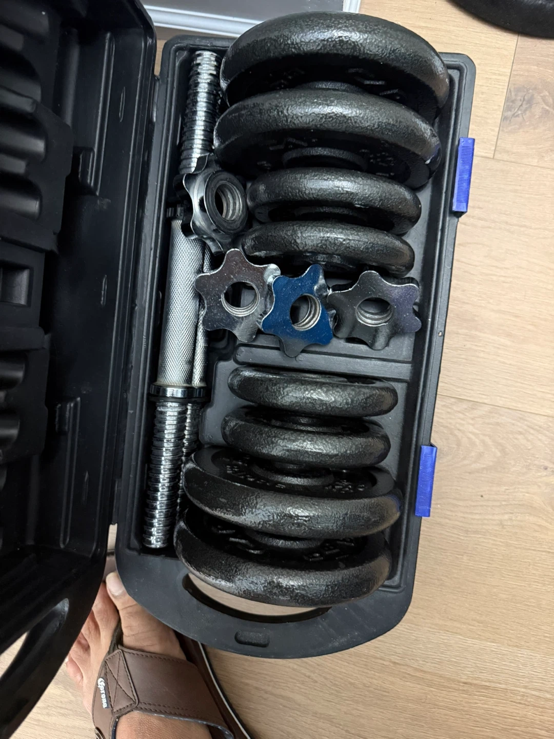 This CAP Barbell adjustable dumbbell set comes with a carrying case. It includes weights and a bar for workouts. Great for building strength at home!