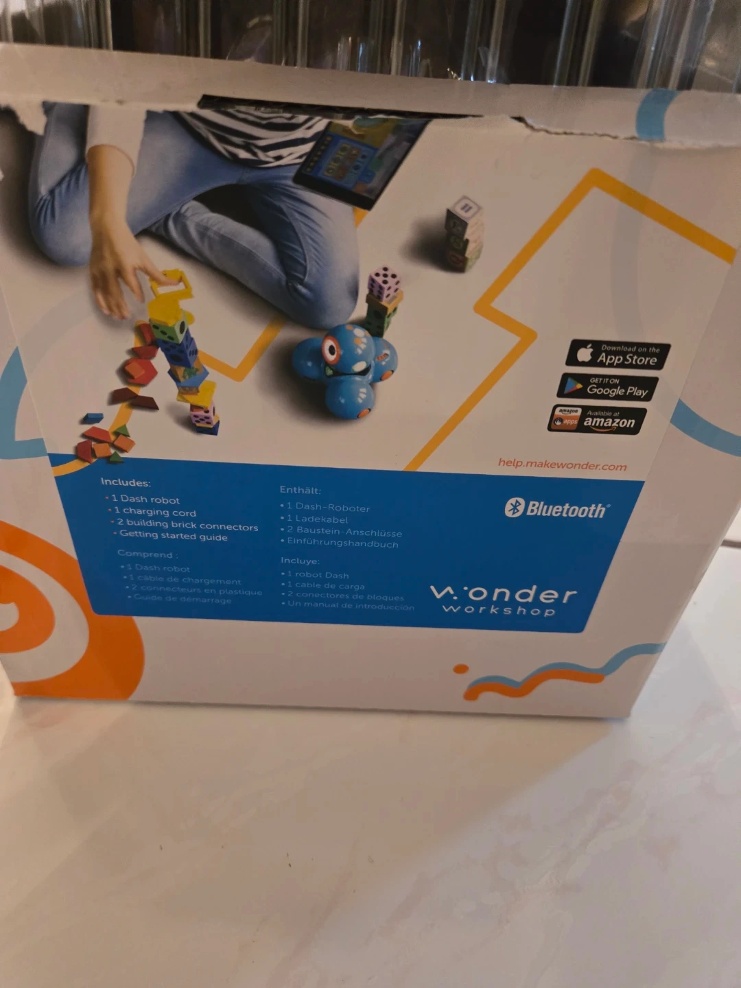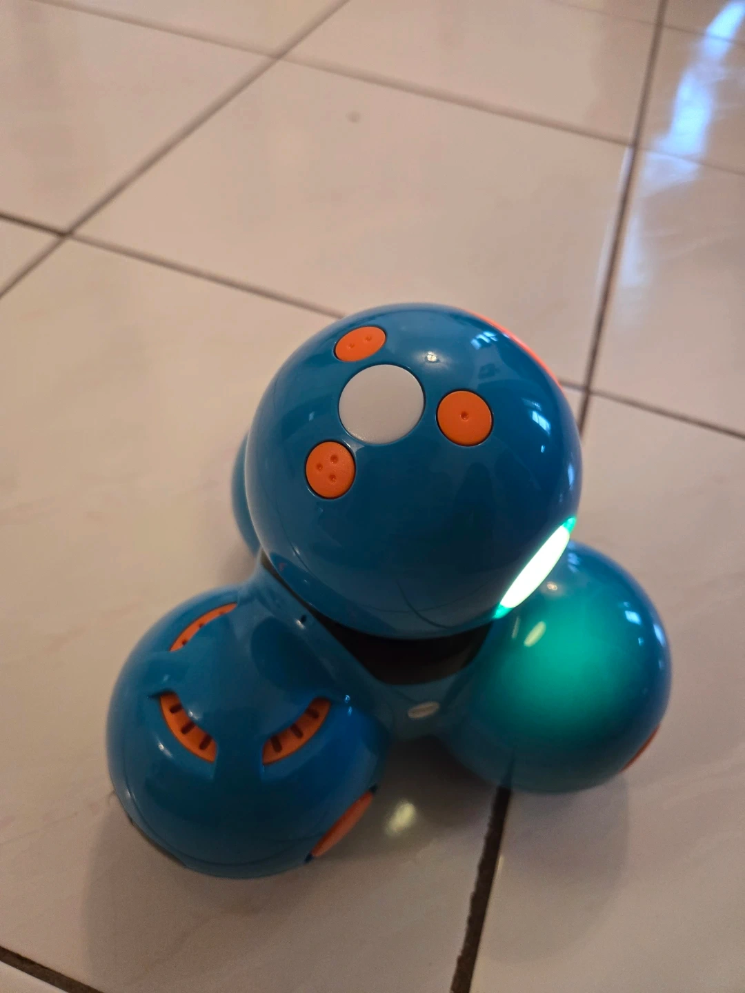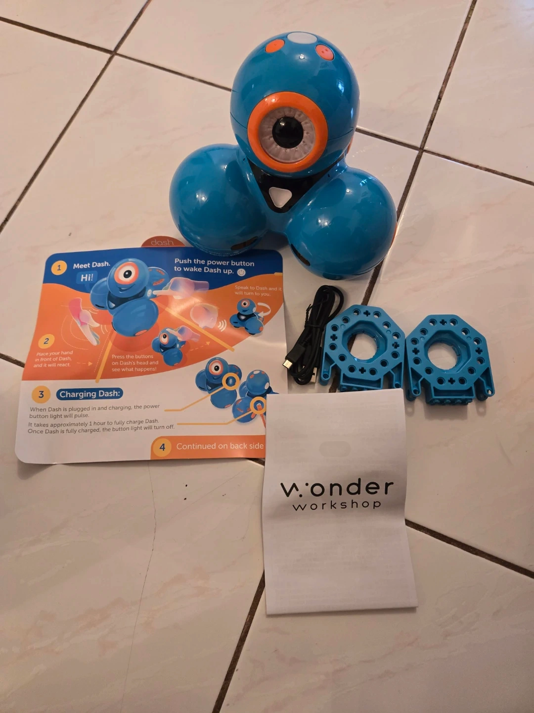 This is a Wonder Workshop Dash Robot. It's blue and comes with a charging cord, building brick connectors, and a getting started guide. Recommended for ages 6+.