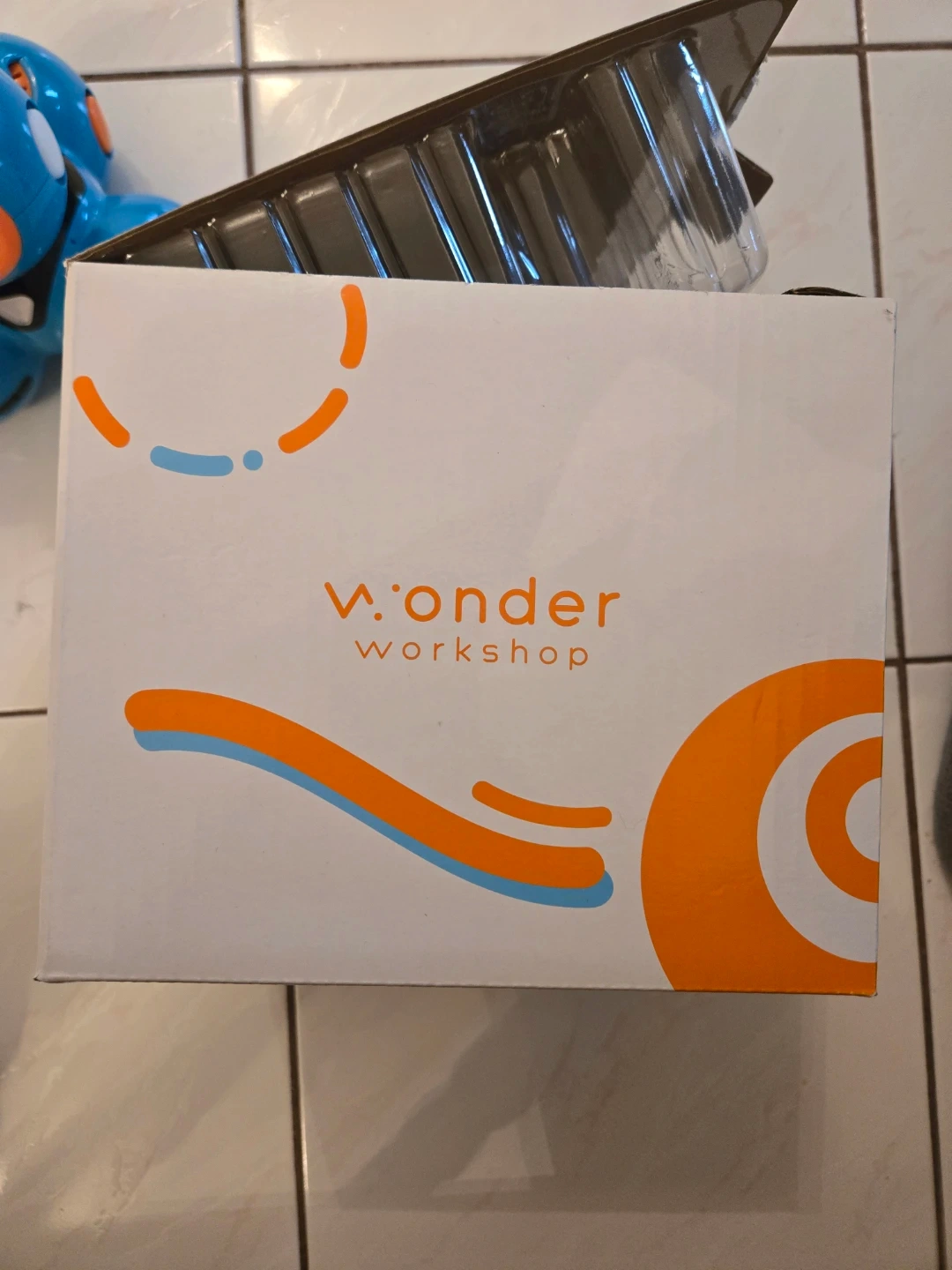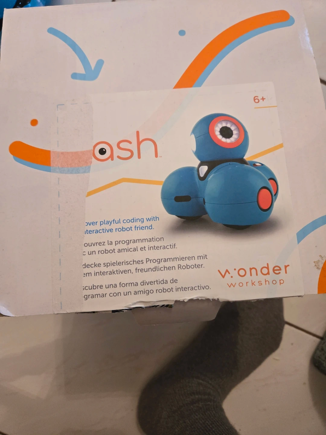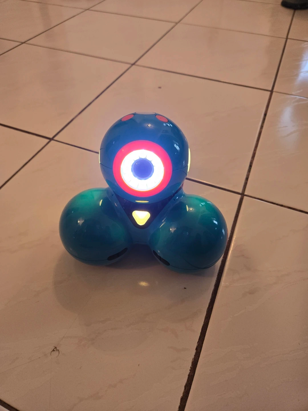 This is a Wonder Workshop Dash Robot. It's blue and comes with a charging cord, building brick connectors, and a getting started guide. Recommended for ages 6+.