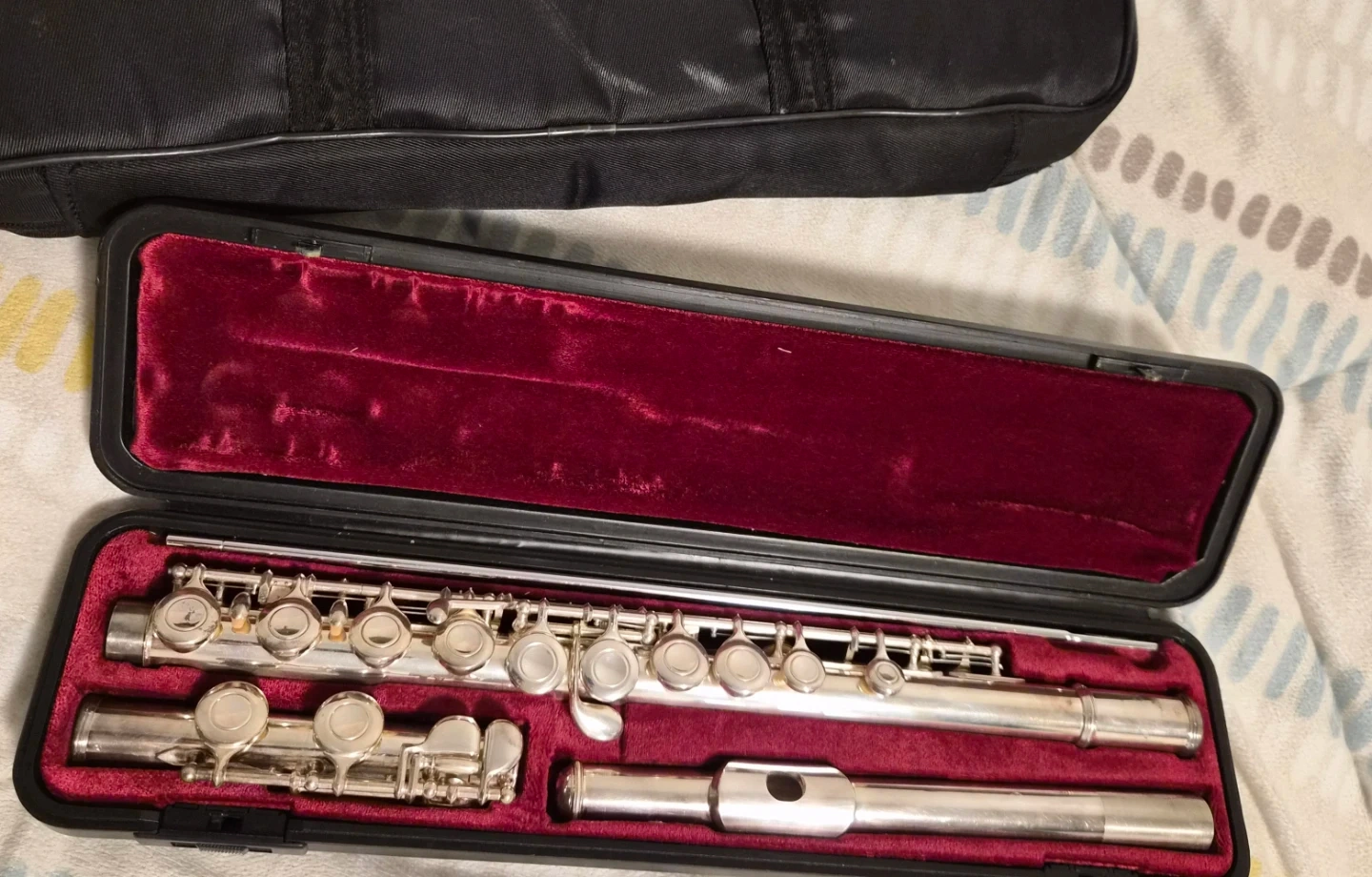 This is a silver-coloured flute, presented in a protective hard case with a velvet lining. The case is enclosed in a black fabric carrying bag. It's a standard flute, perfect for musicians of all levels.