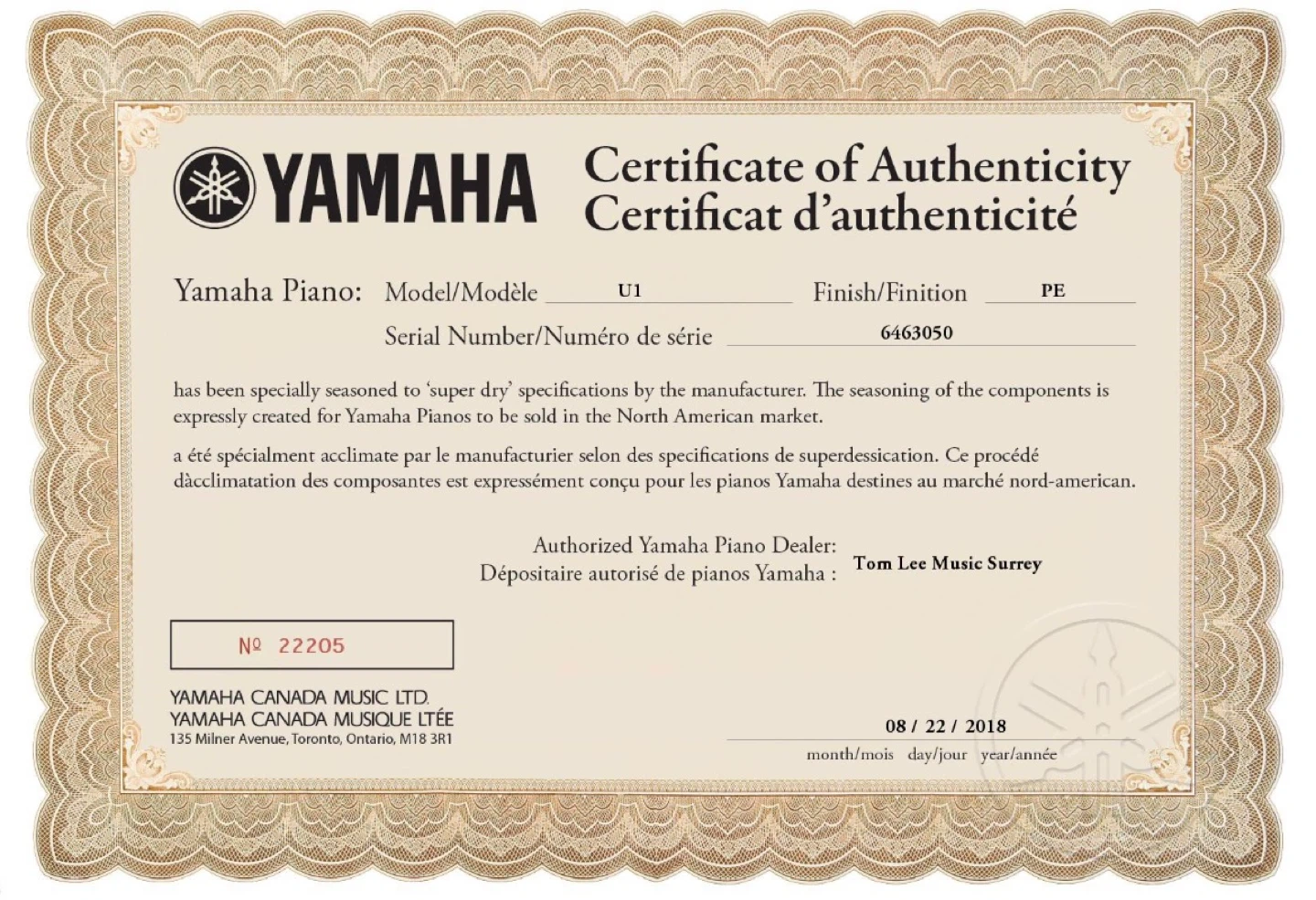 This is a Yamaha U1 upright piano. It's black and has a PE finish. The serial number is 6463050. This piano was specially seasoned for 'super dry' specifications by the manufacturer. It's perfect for musicians needing a reliable instrument.