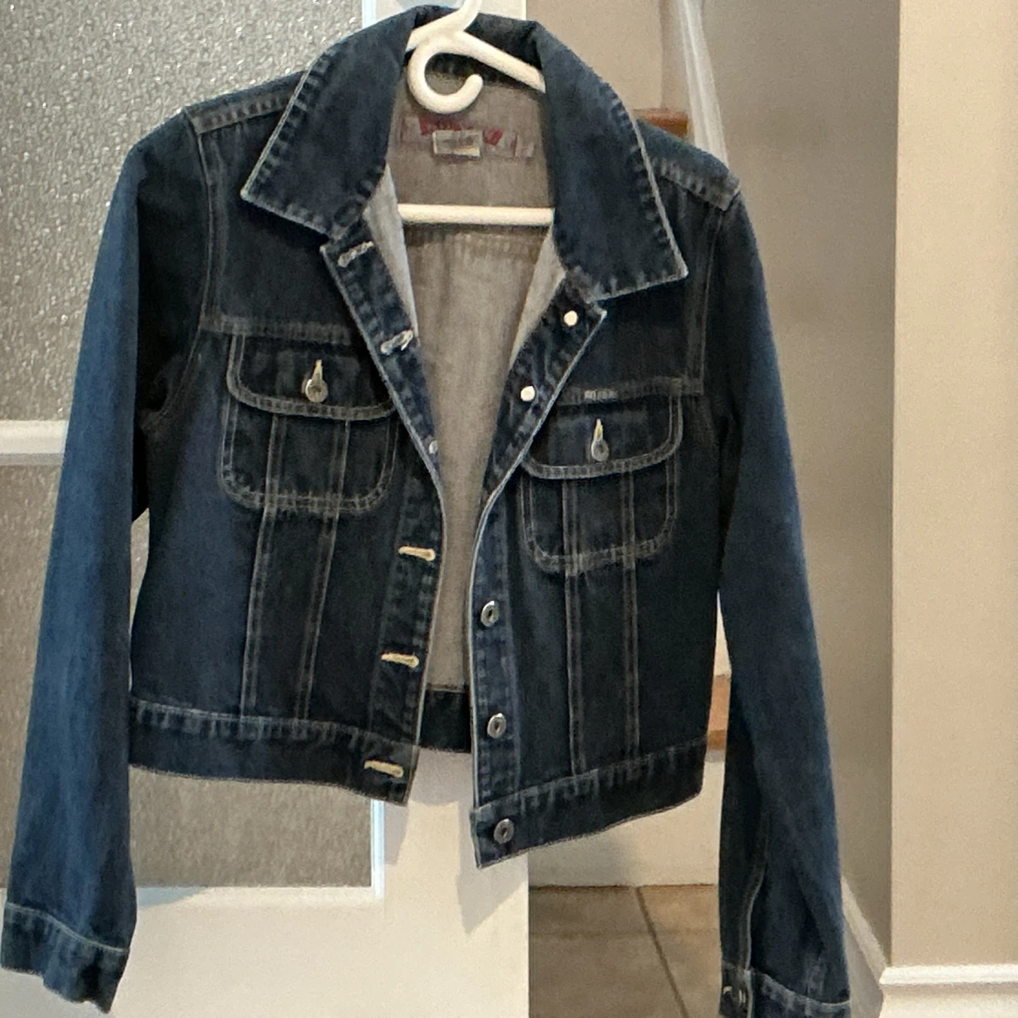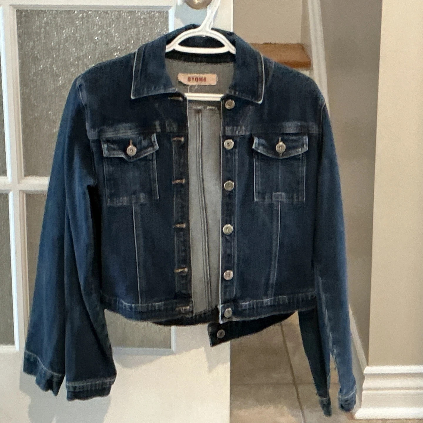 Classic blue denim jacket with button closures. Features two chest pockets. Denim material. 2 jackets. One is Stone brand, the other Silver. Both medium