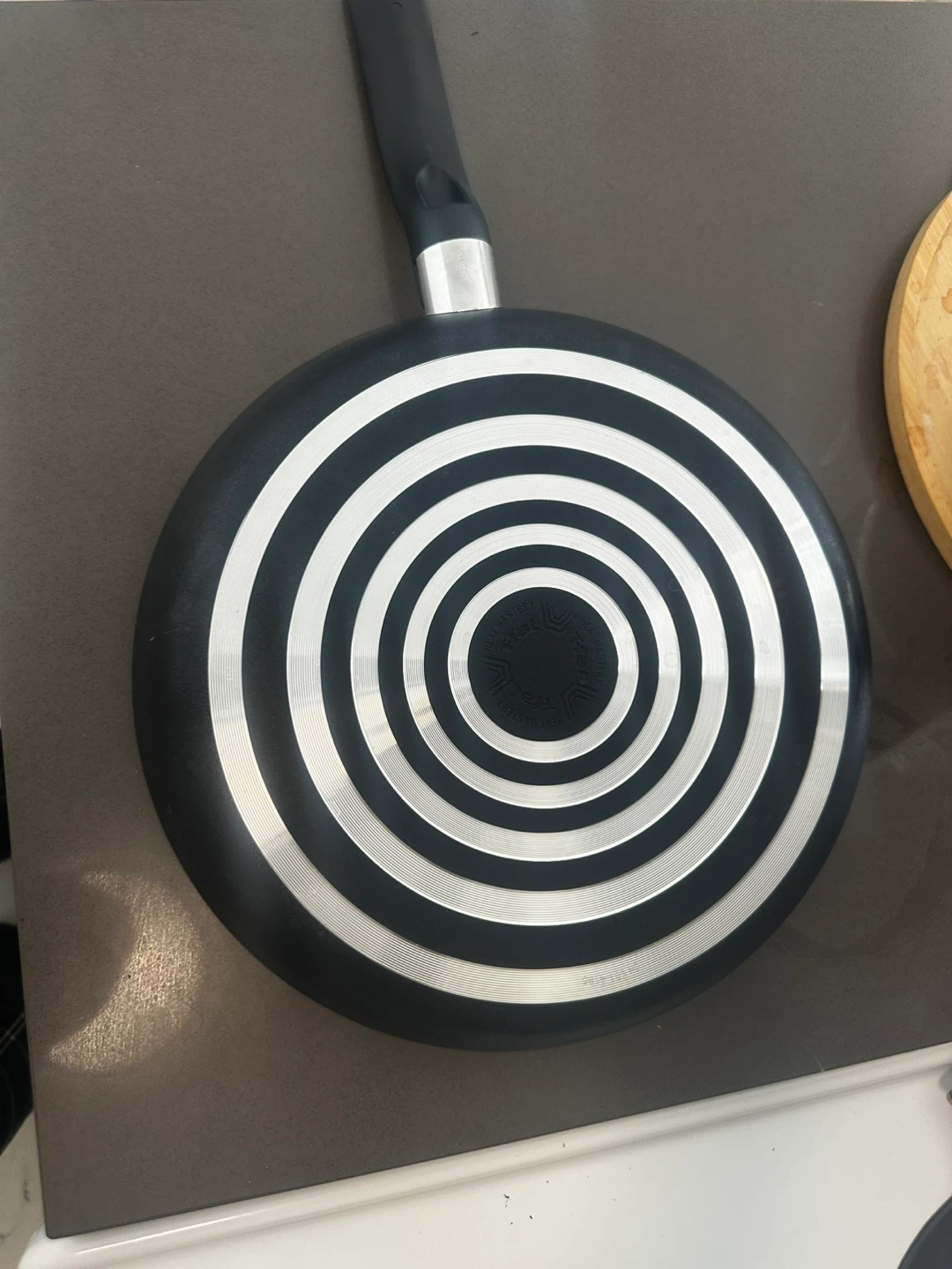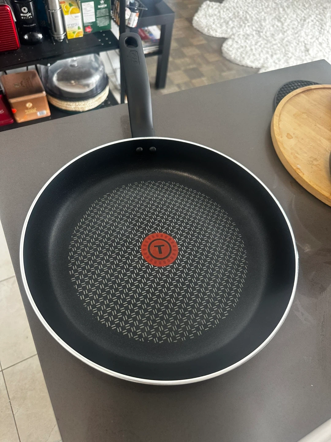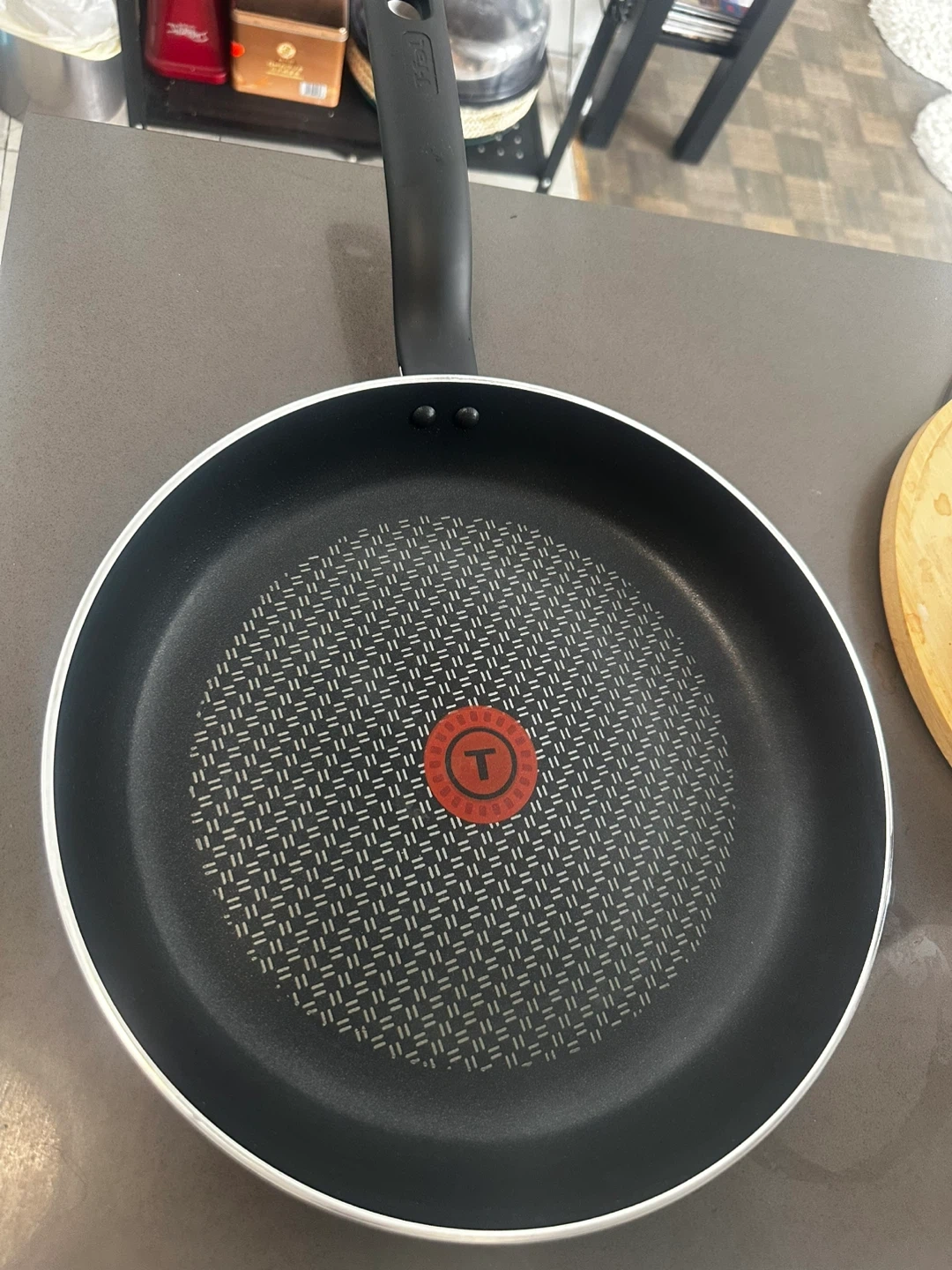 New BrandThis is a T-fal frying pan with a non-stick interior. It has a sturdy black handle and a distinctive T-fal thermo-spot indicator in the centre. Its design is suitable for everyday cooking tasks.