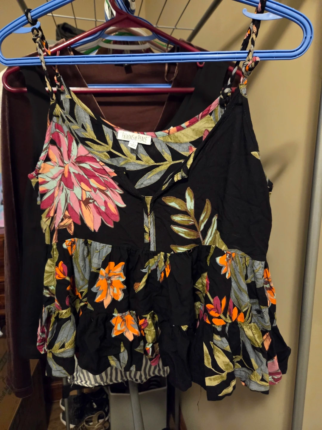 This is a Patrons of Peace cami top with a black base and a vibrant floral print. It features braided straps and a tiered, ruffled hemline. The fabric feels light and airy.