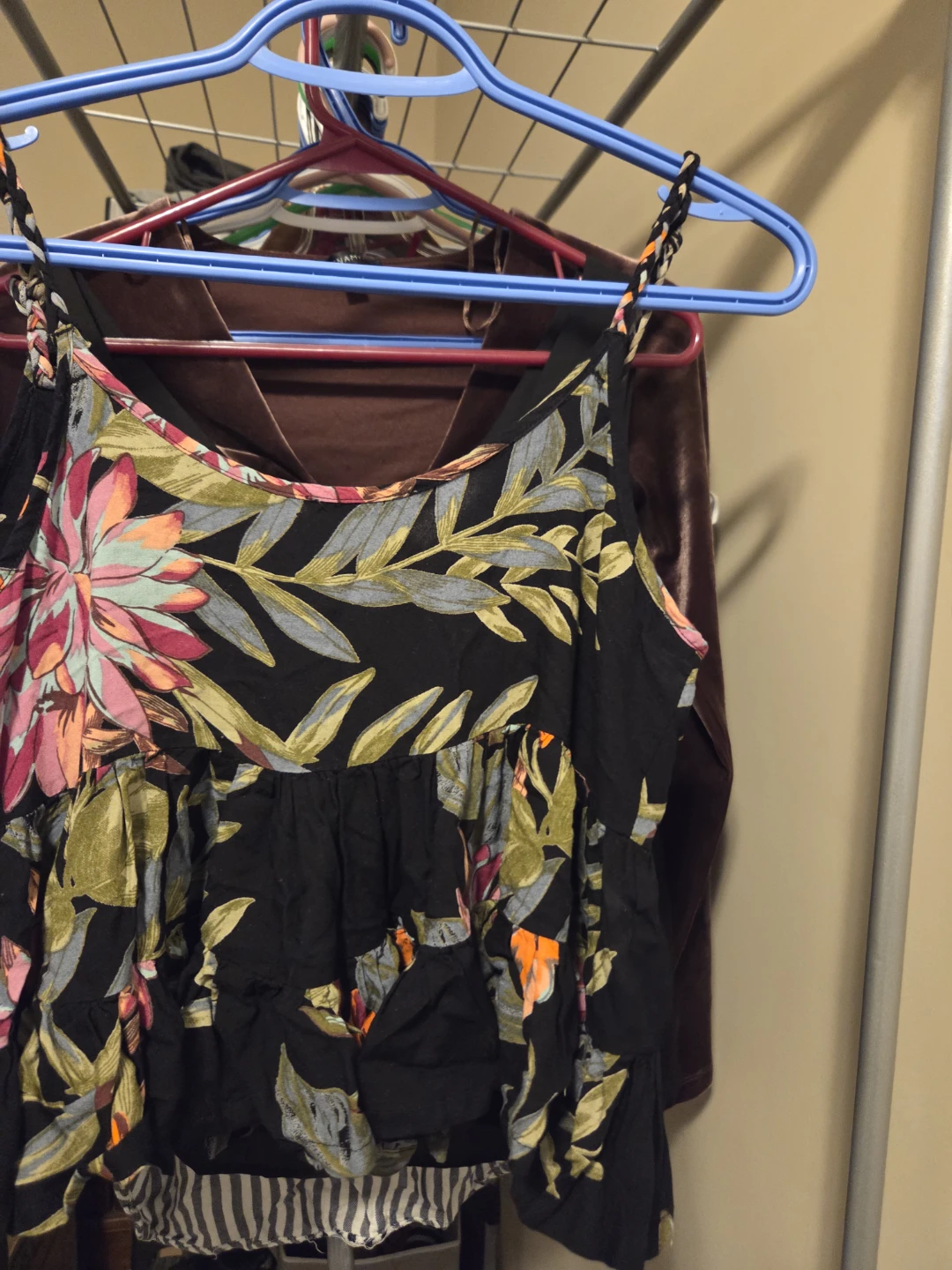 This is a Patrons of Peace cami top with a black base and a vibrant floral print. It features braided straps and a tiered, ruffled hemline. The fabric feels light and airy.