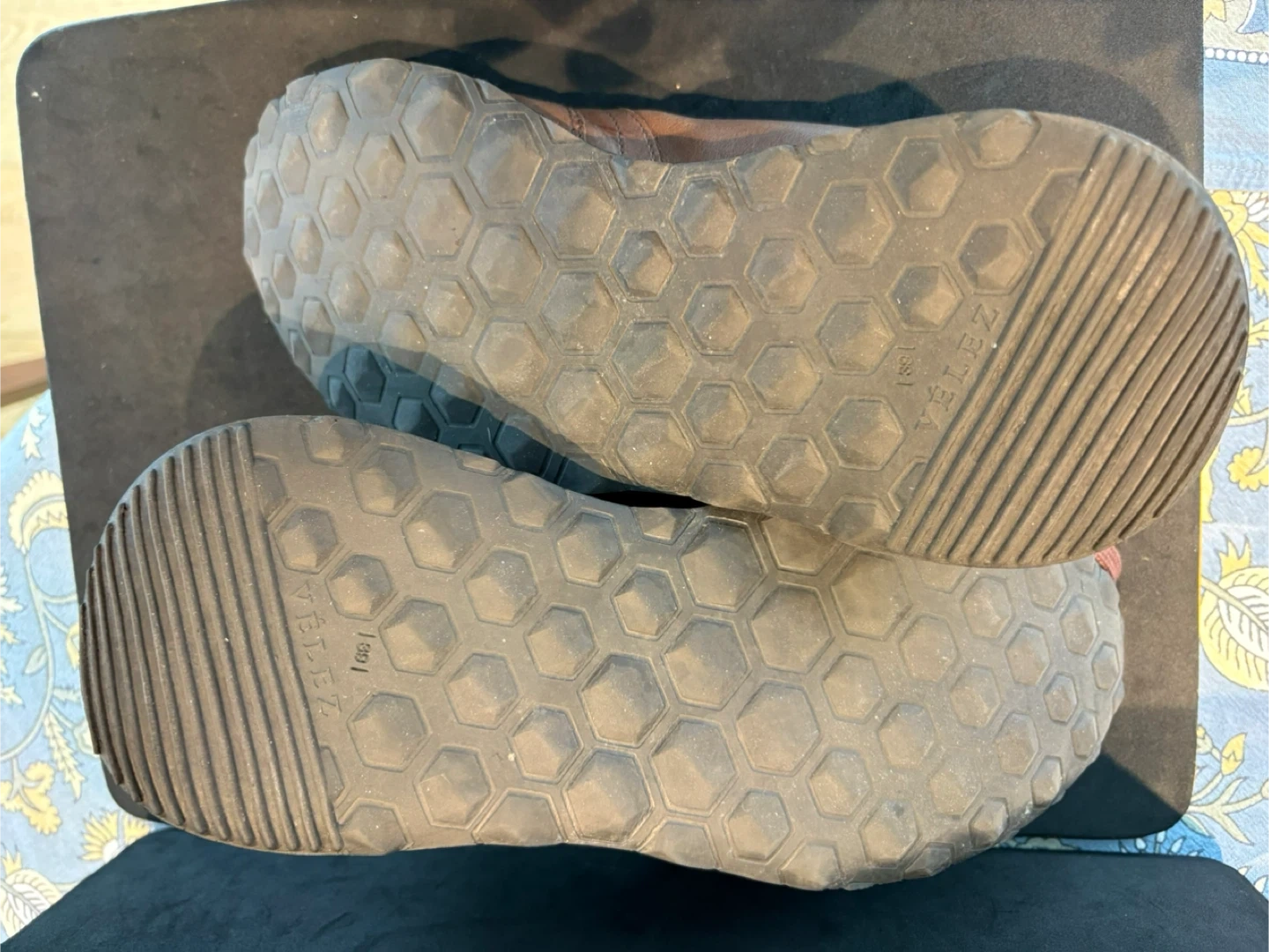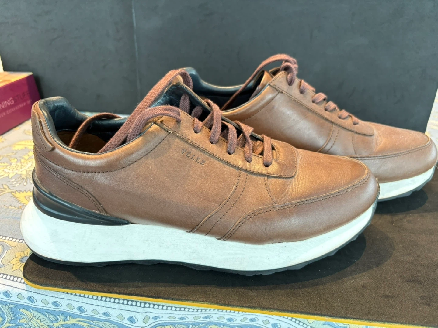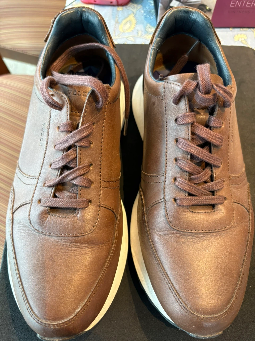Brown leather lace-up sneakers from Velez. These casual shoes have a comfortable white sole. Great for everyday wear!