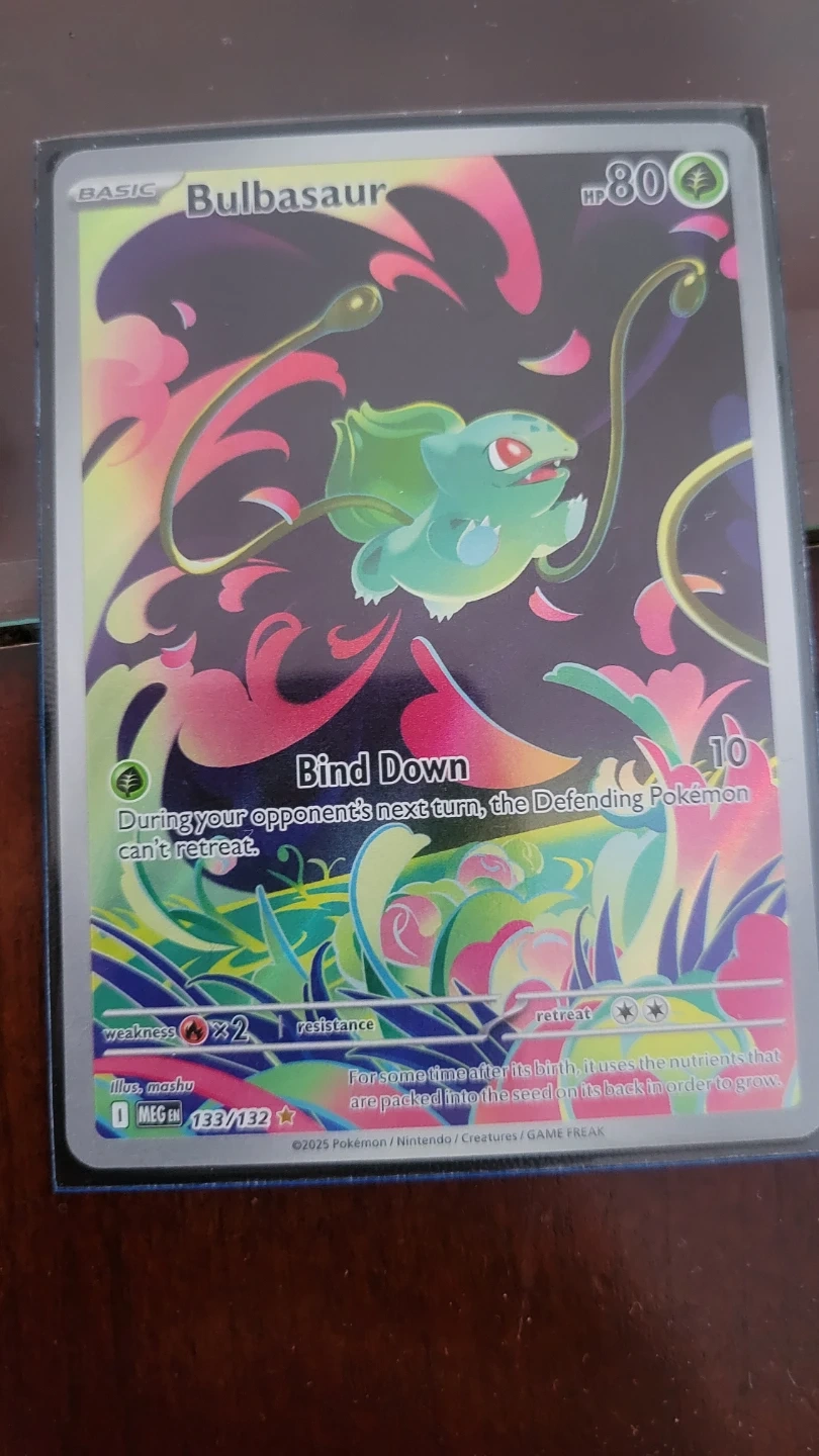 This is a basic Bulbasaur Pokemon card. It has 80 HP and a 'Bind Down' ability. The card is part of the 133/132 set.