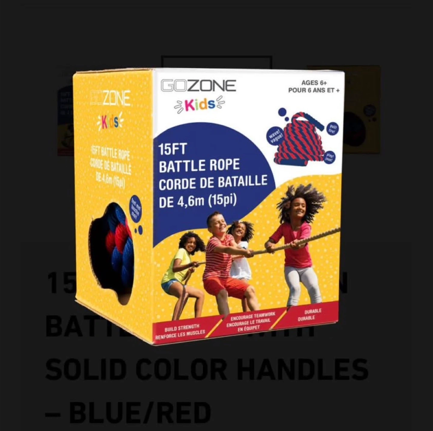 Selling a brand new GoZone Kids 15ft Battle Rope! This rope is great for kids ages 6 and up. It helps build strength and encourages teamwork. The handles are a solid blue and red colour. It's still in the original packaging!