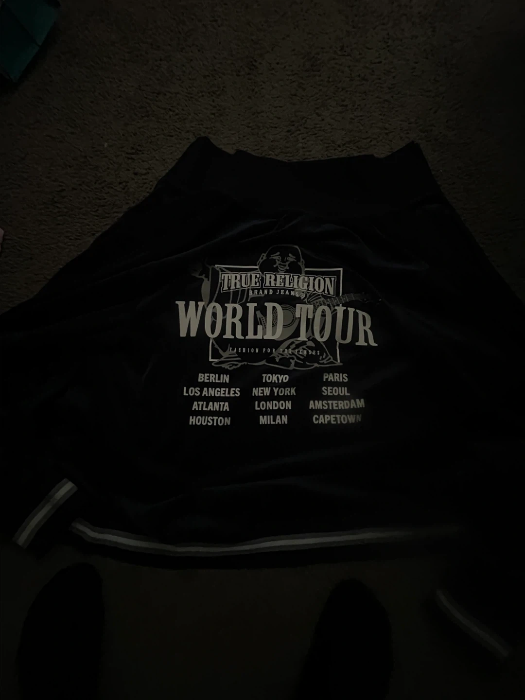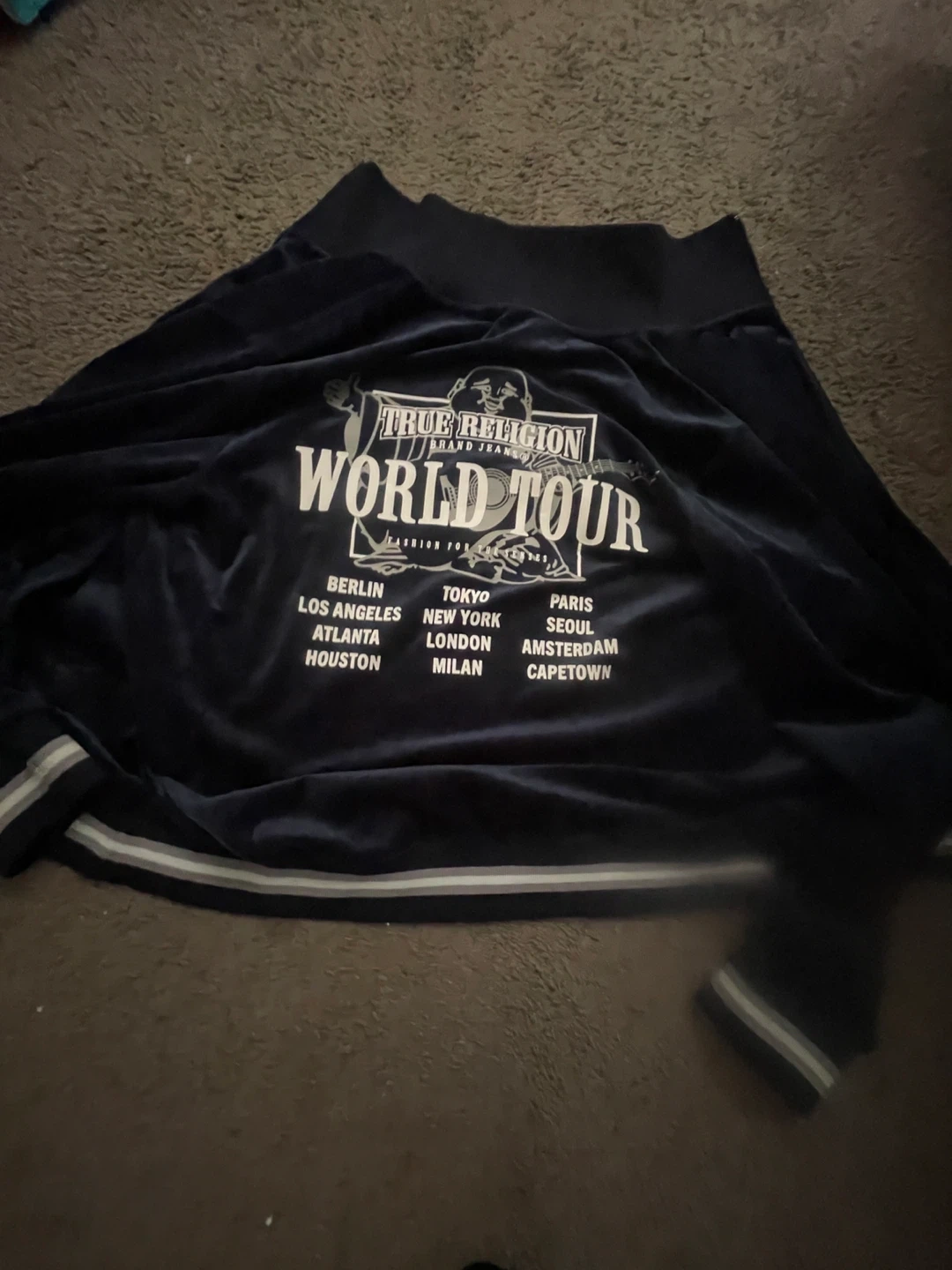 This True Religion velour track jacket features a "World Tour" graphic on the back with a list of cities. It has a zippered front and striped cuffs and hem. Made from soft velour material. A comfortable and stylish outerwear piece.