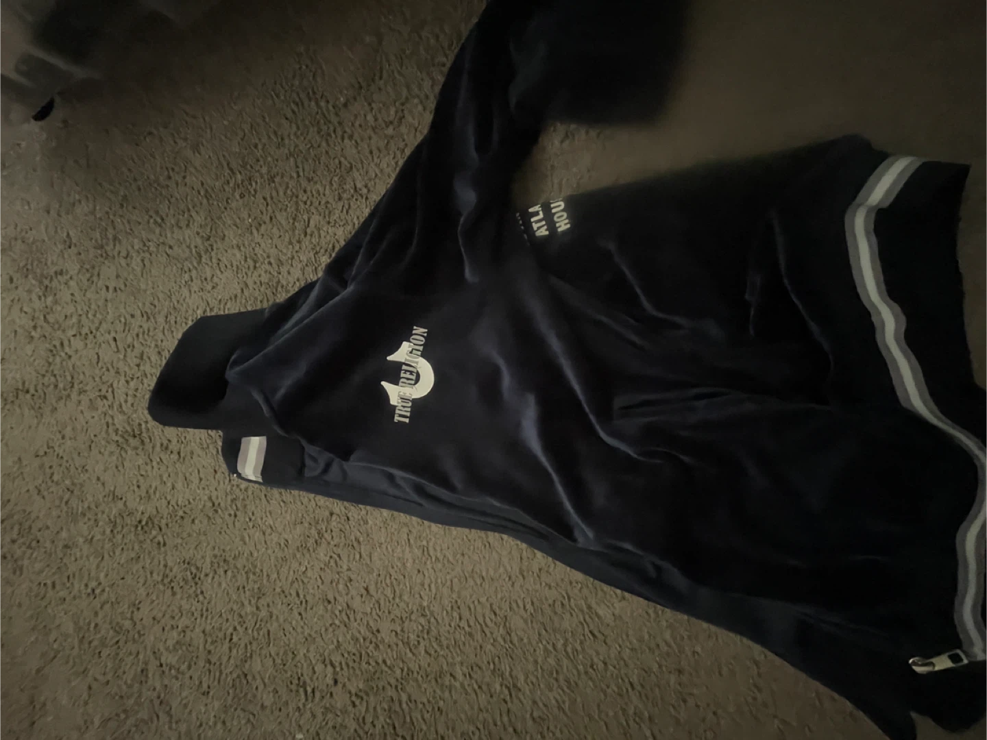 This True Religion velour track jacket features a "World Tour" graphic on the back with a list of cities. It has a zippered front and striped cuffs and hem. Made from soft velour material. A comfortable and stylish outerwear piece.