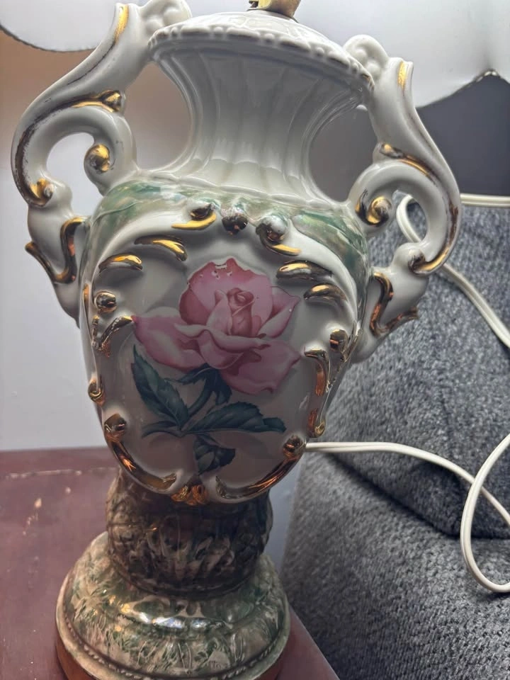 Vintage Capodimonte Art Deco urn style porcelain table lamp with hand painted pink rose motif and gilded accents. Updated cord. Pick up in Keswick. Willing to deliver anywhere in Georgina, Newmarket and Aurora.