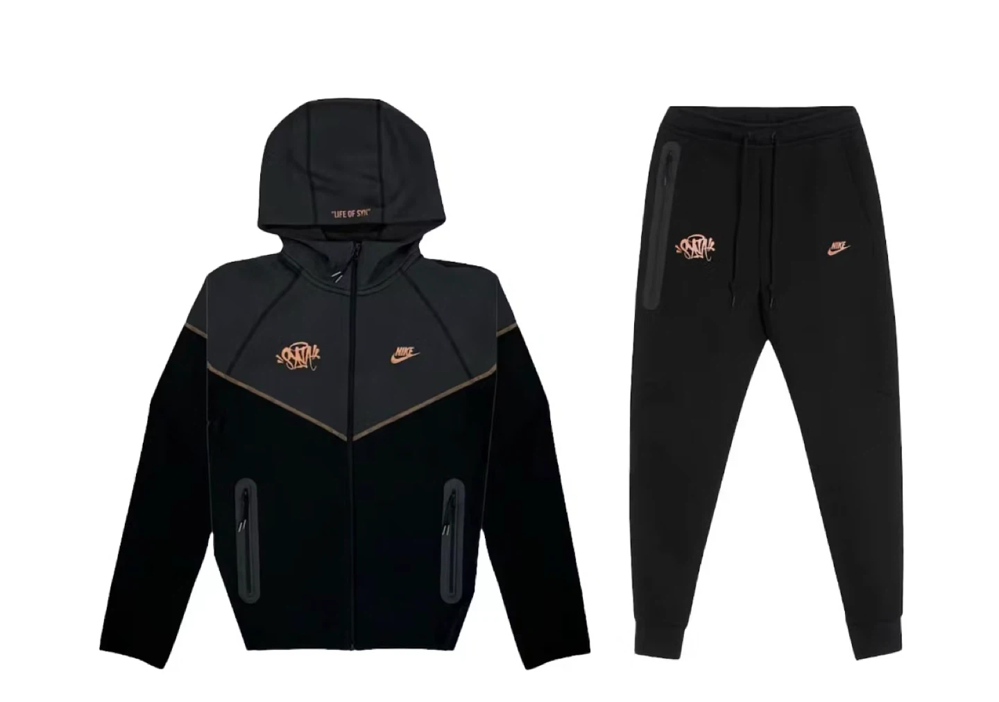 This is a Nike Tech Fleece tracksuit set in black. It includes a full-zip hooded jacket and matching sweatpants. The set features rose gold accents and branding.