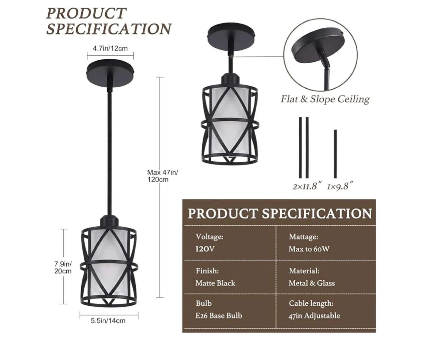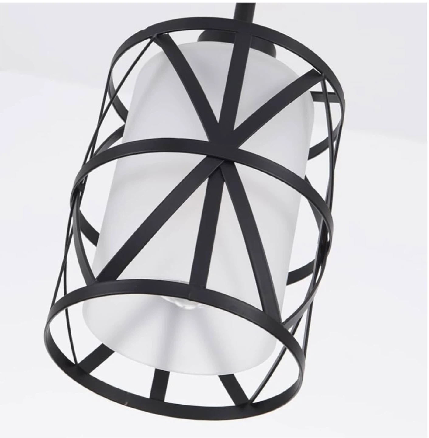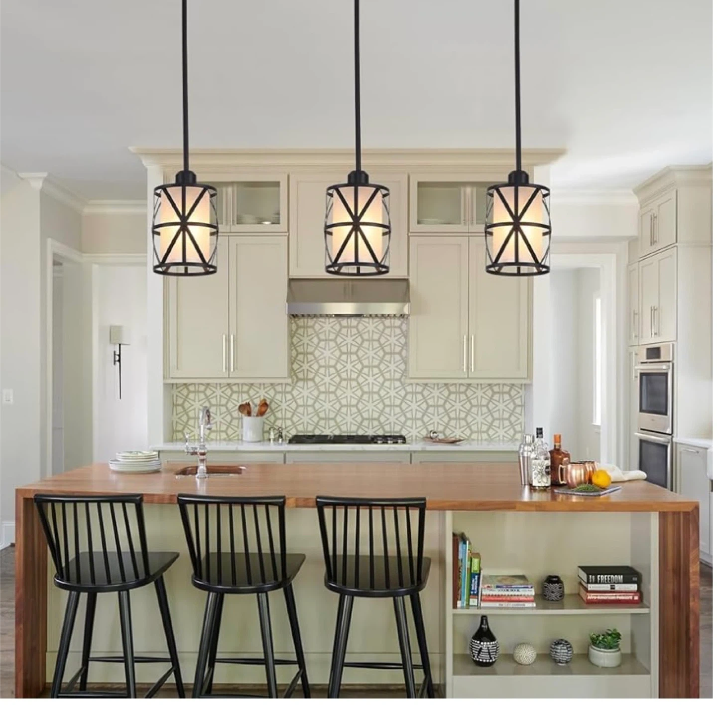 This is a set of three industrial-style pendant lights. They feature a black metal cage design surrounding a frosted glass cylinder. These lights are suitable for installation on both flat and sloped ceilings, making them versatile for various kitchen or dining spaces. They'd be great for adding a modern farmhouse or rustic touch to your home!