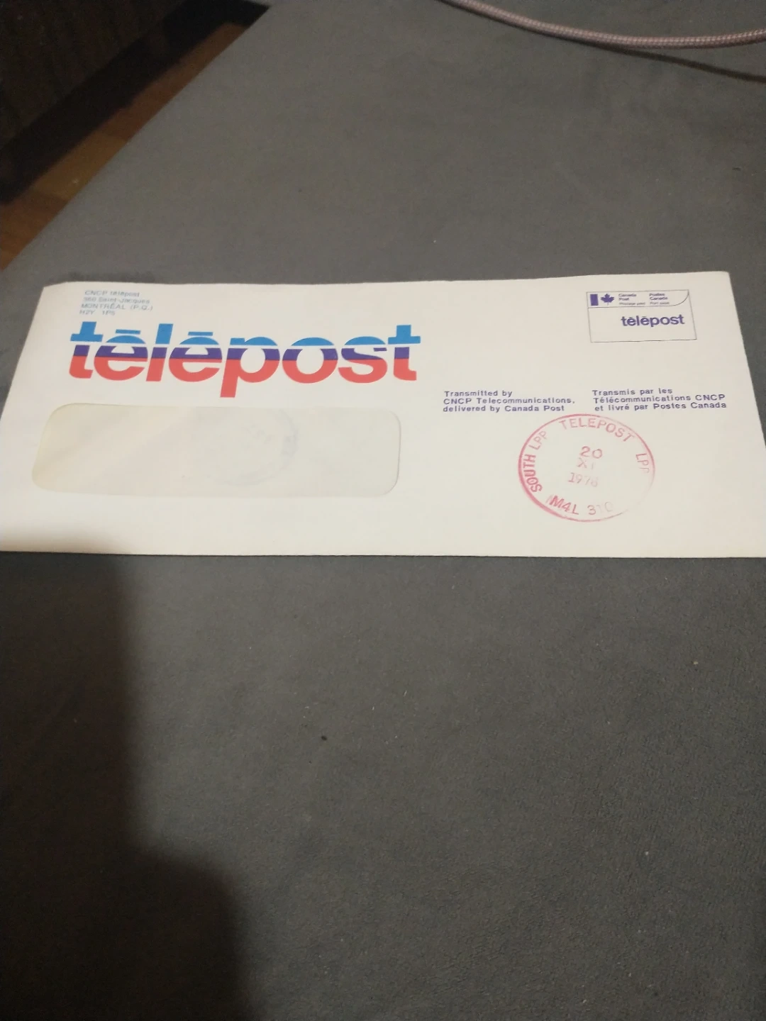 This is a Telepost envelope from 1978. It was transmitted by CNCP Telecommunications and delivered by Canada Post. The postmark indicates it was processed on November 20, 1978.