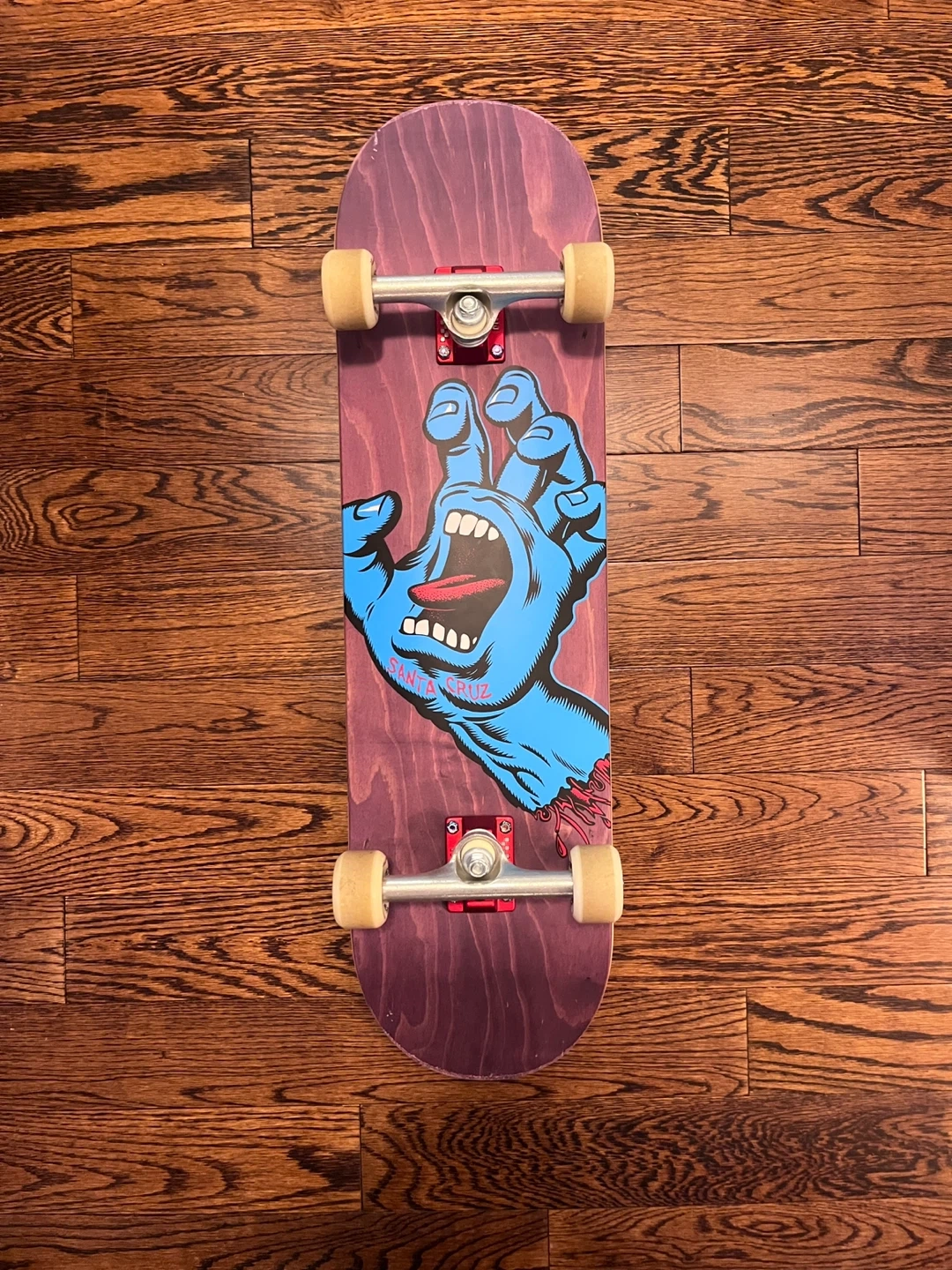 Santa Cruz skateboard with the iconic screaming hand graphic. It's a standard skateboard, ready for cruising or tricks! The deck is made of wood with grip tape on top.