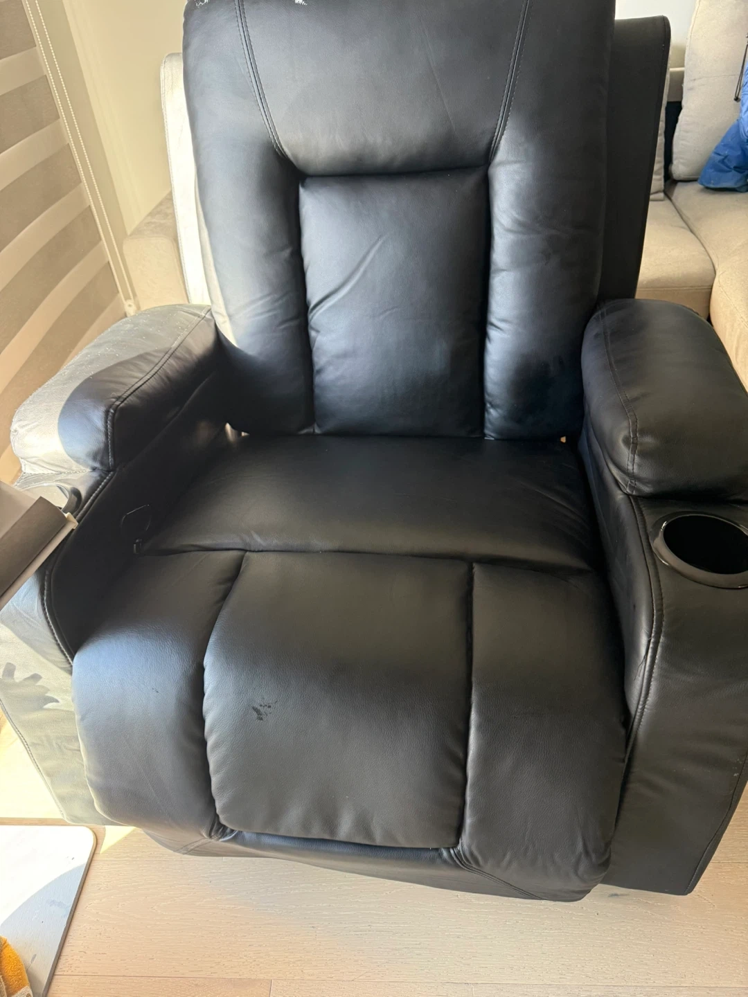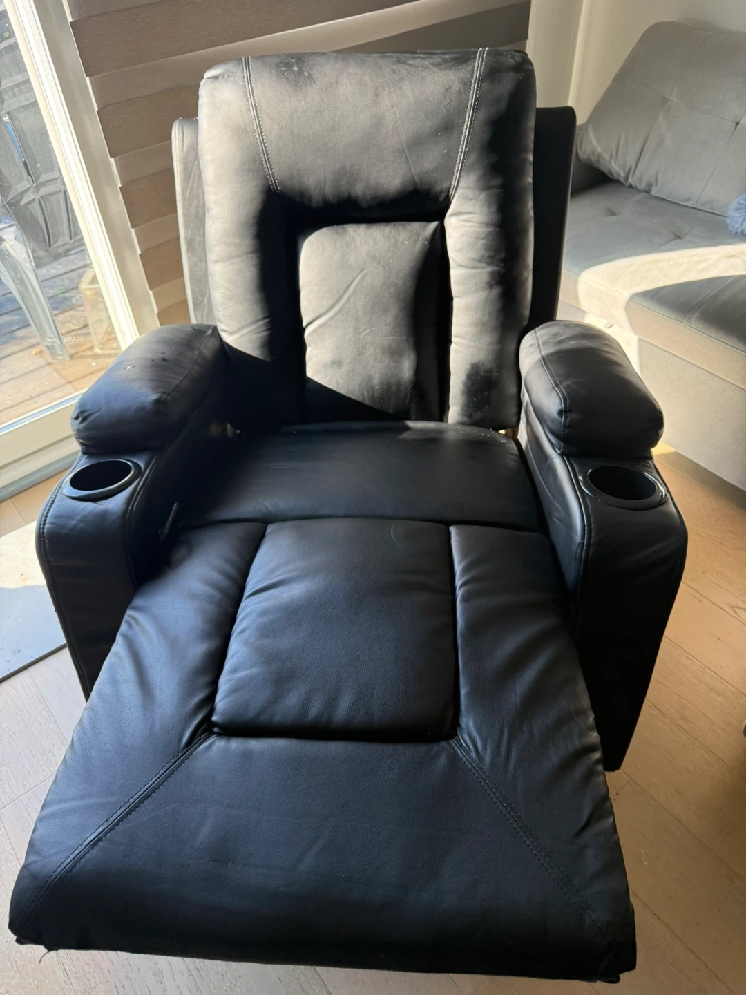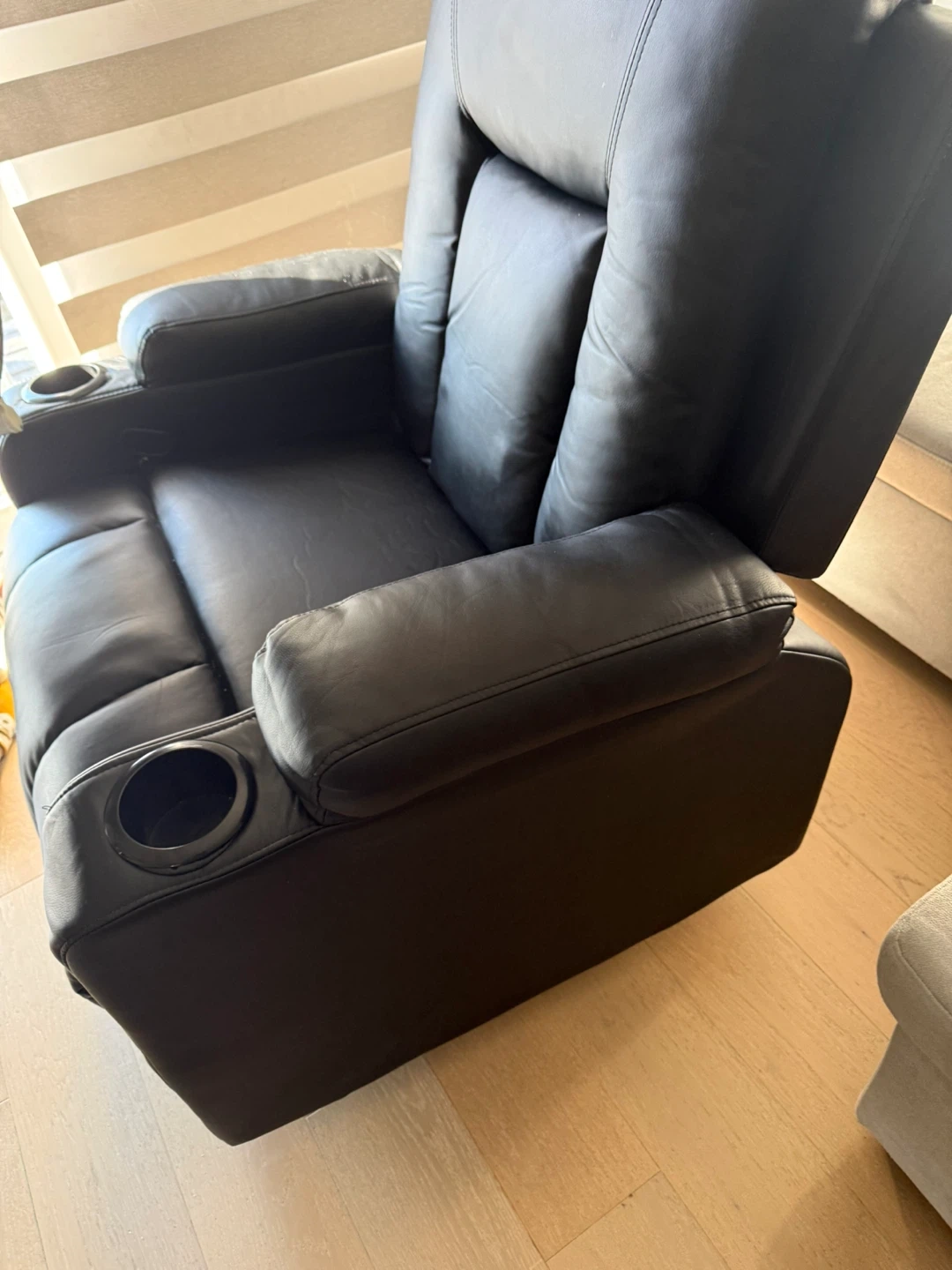 This black faux leather recliner chair offers comfort and convenience. It features two built-in cup holders on the armrests. The reclining mechanism works smoothly, making it great for relaxing.