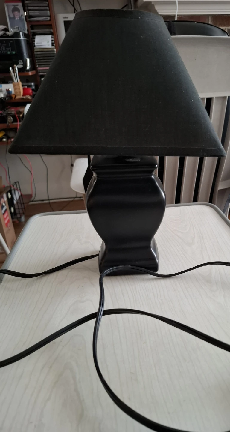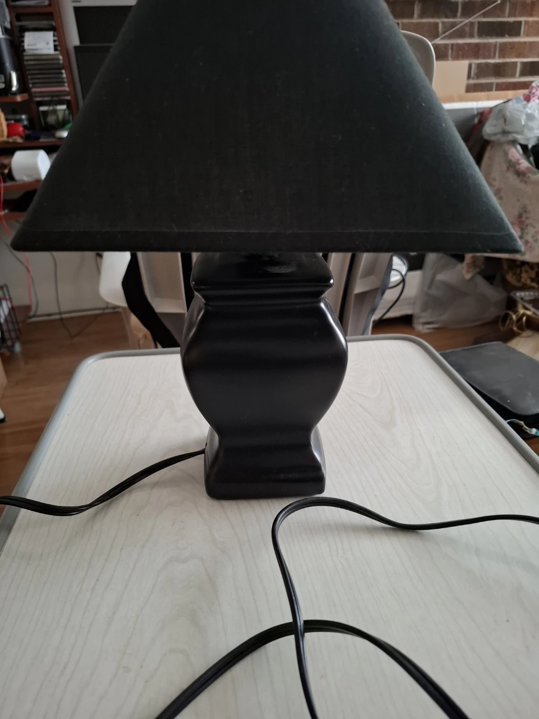 This is a black table lamp with a square shade. It's a nice accent piece for any room. The lamp has a classic design.