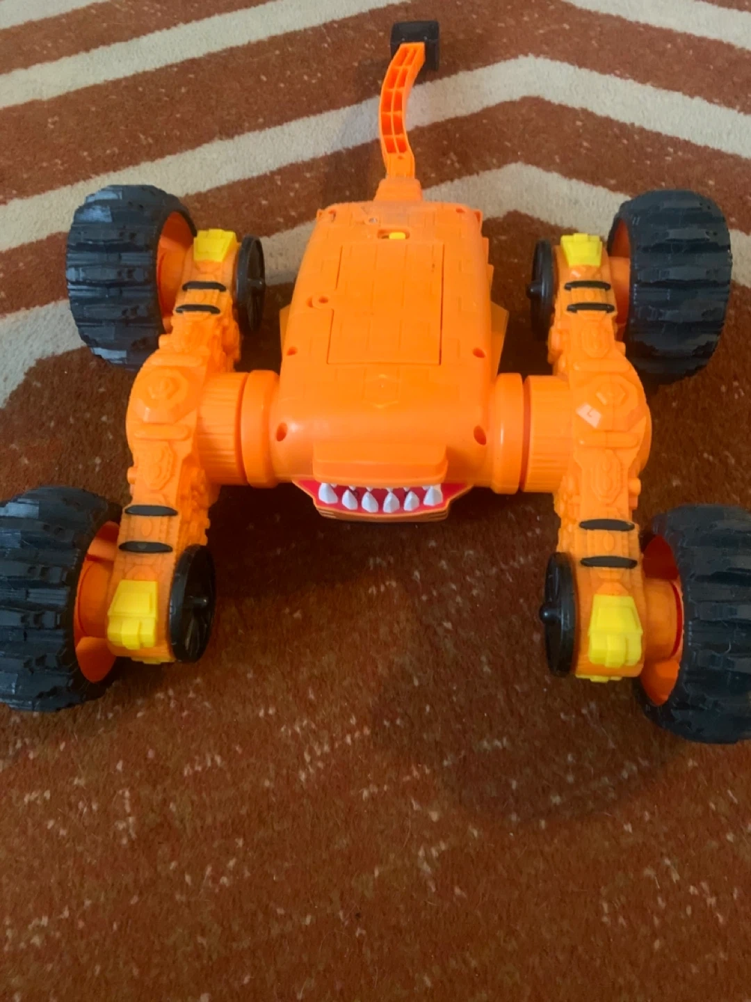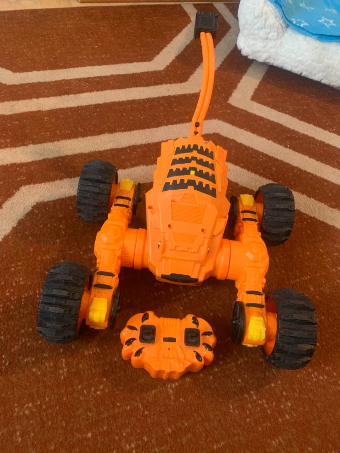 Fun remote-controlled stunt car shaped like a tiger. It's bright orange with big black wheels for off-road action. Comes with a cool tiger-themed remote control.