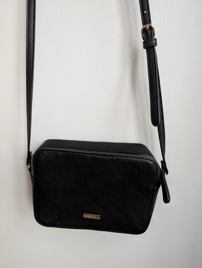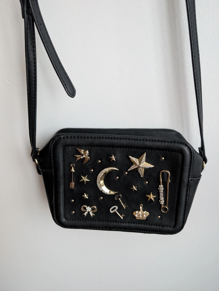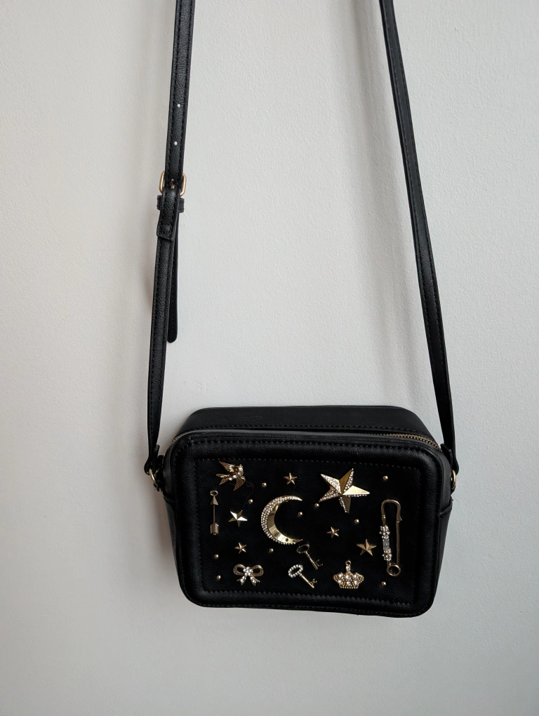 Adorable black crossbody bag. Features gold embellishments including stars, a crescent moon, keys, and more. Adjustable strap. Small rectangular shape.