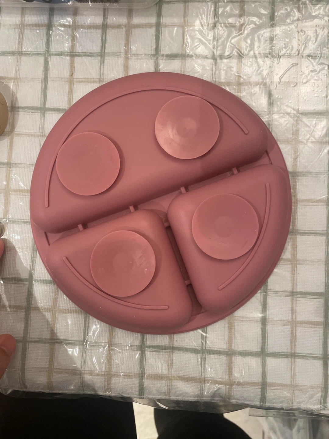 a pink silicone suction plate, perfect for babies and toddlers! It's in great condition and ready for a new home. The suction bottom helps keep the plate in place during mealtimes, reducing spills and messes. It's also divided into sections, making it easy to serve a variety of foods. Great for starting solids!