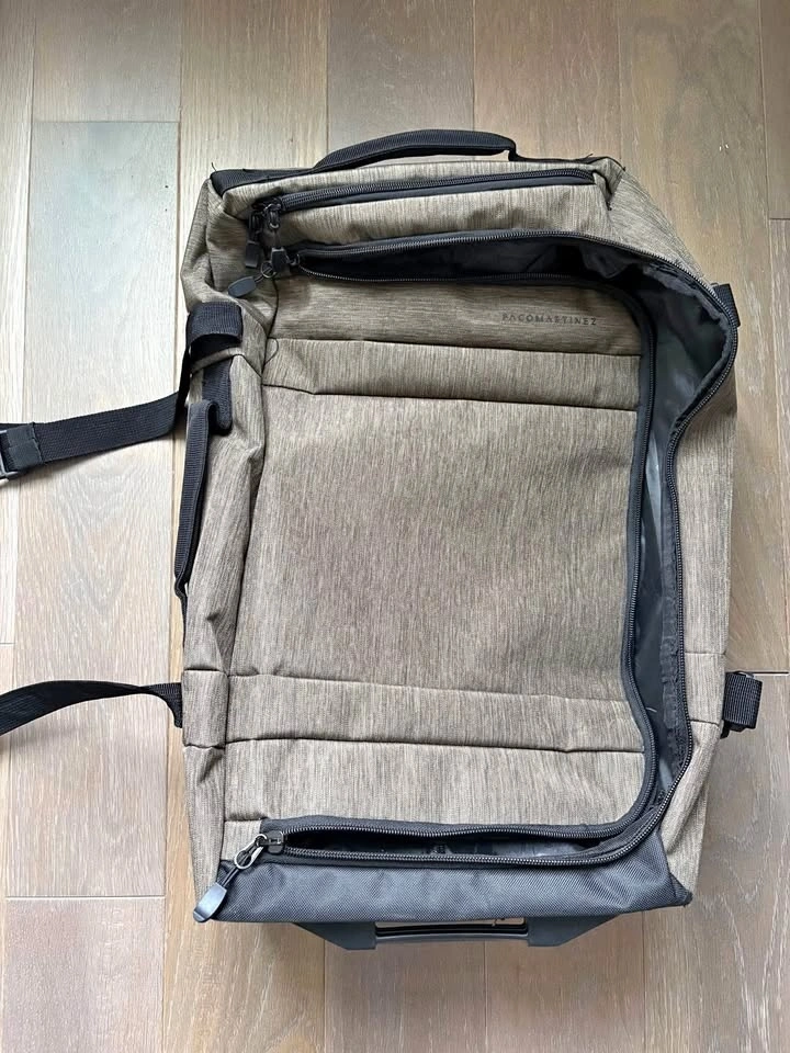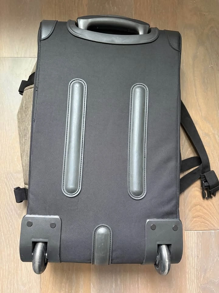 Black and khaki. Used once, like new. Sturdy construction with upper and side handles and belts for added protection. Features an inside pocket and a secret pocket on top. Aluminum frame, very light. Originally 49.99 euros.